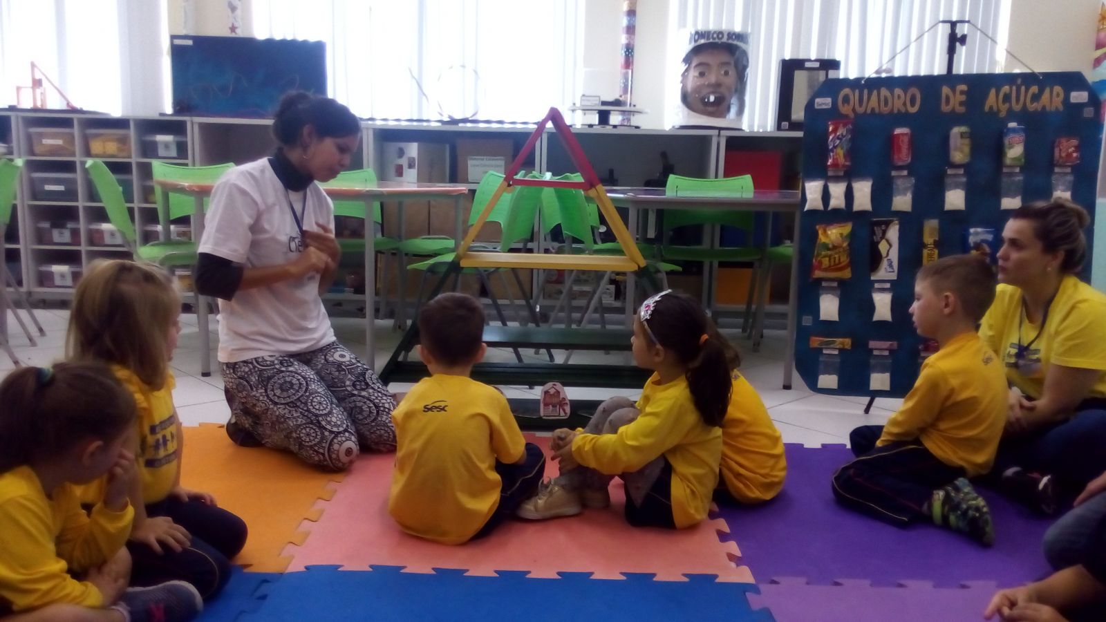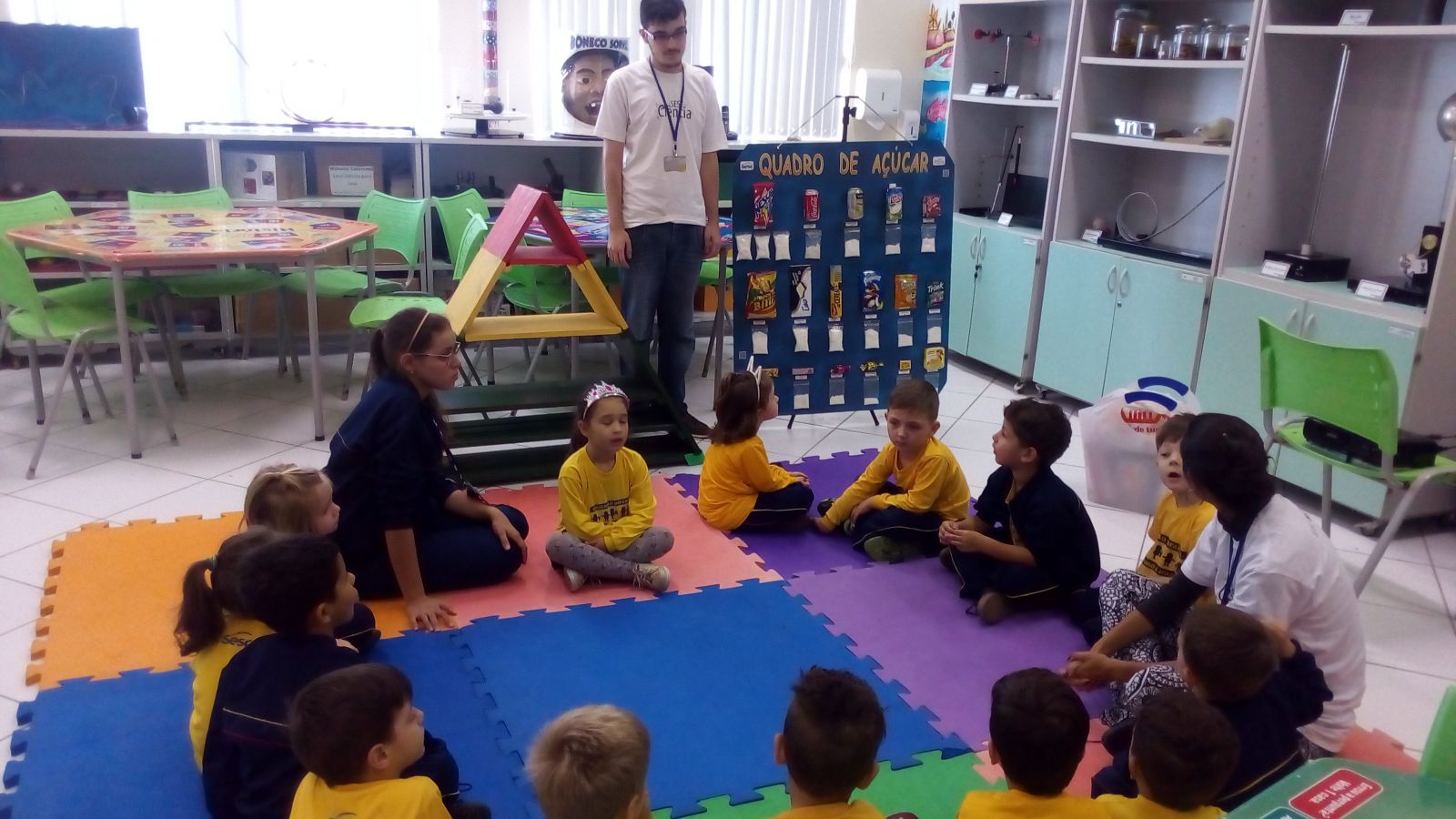 As crianças da Educação Infantil da Unidade de Joinville visitaram a Sala de Ciências e puderam observar e conhecer a pirâmide alimentar. Para que todo o trabalho se tornasse significativo e concreto para as crianças, elas trouxeram embalagens de alimentos consumidos em suas casas e realizaram sua classificação colocando-as na pirâmide, visualizando o que se pode comer em maior e menor quantidade.