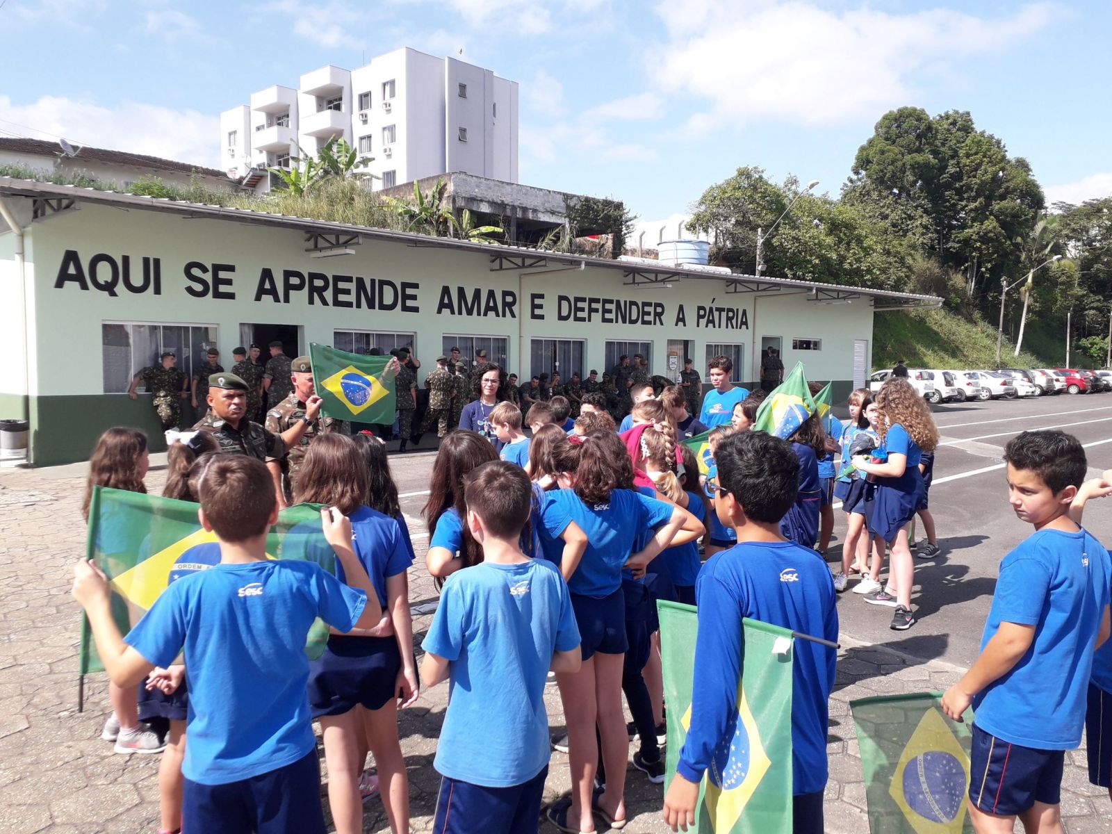 No dia 19 de novembro, os alunos do 4º ano matutino do Ensino Fundamental da Escola Sesc Brusque participaram da cerimônia em comemoração ao Dia da Bandeira, realizado no Tiro de Guerra. Os estudantes tiveram a oportunidade de conhecer como são feitas as homenagens e as marchas dos Atiradores e aprender mais sobre a Bandeira Nacional. O Subtenente Rubens Justiniano Evangelista explanou sobre o tempo de existência, quantas bandeiras o Brasil já teve até chegar a atual, e sobre o significado das cores e das estrelas na bandeira.