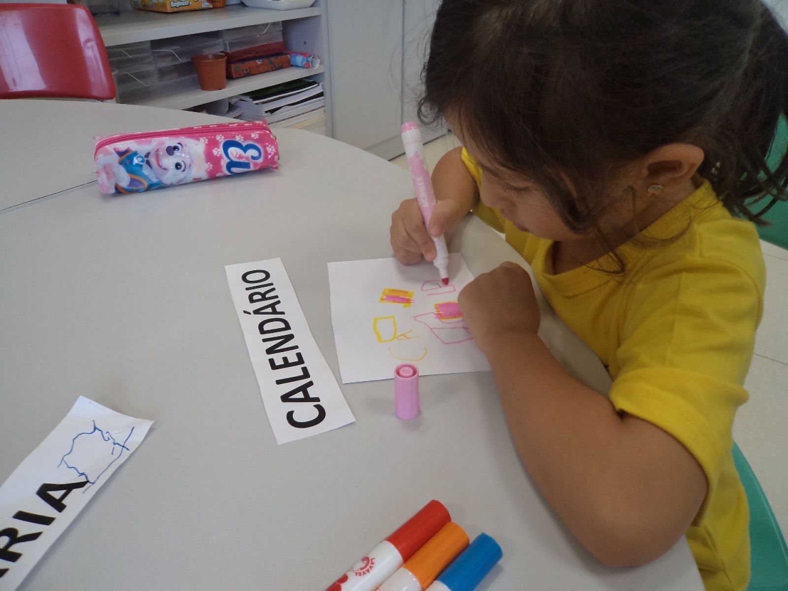 Juntamente com a rotina acontece o momento do calendário, que também é construído pelas crianças diariamente, que escrevem os números e criam símbolos para cada dia, fazendo o uso do calendário convencional como referência.