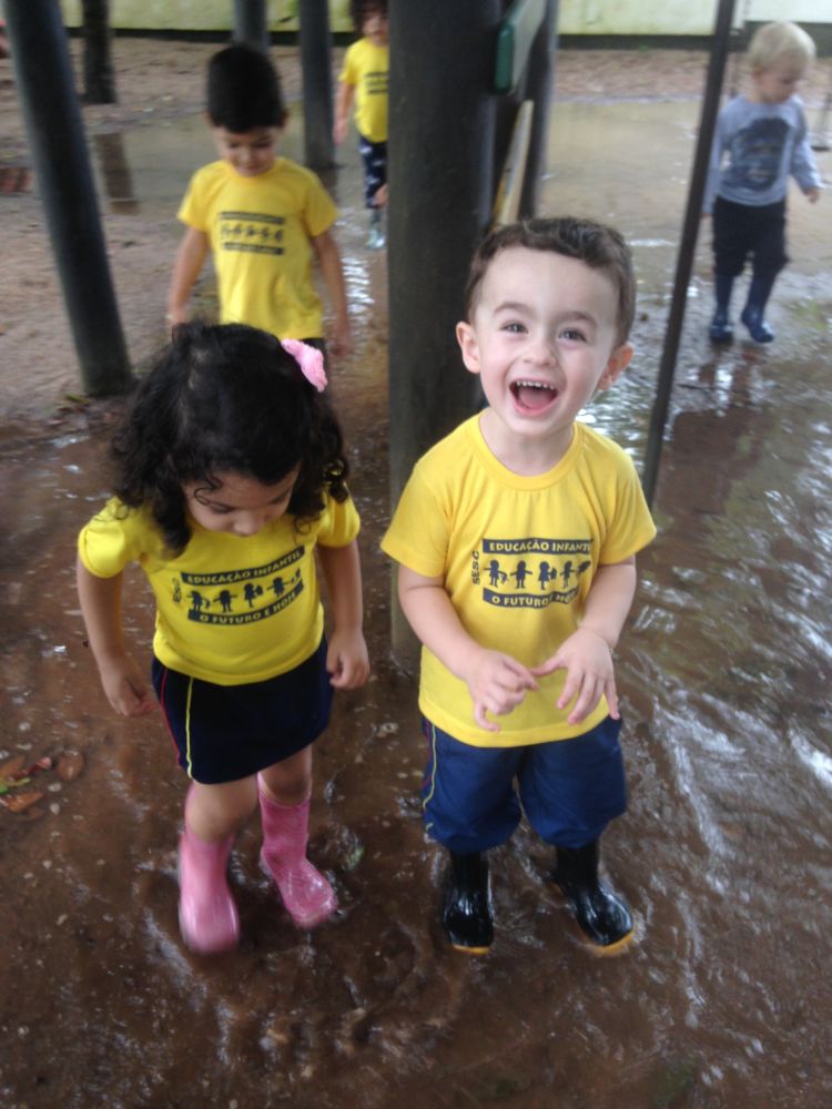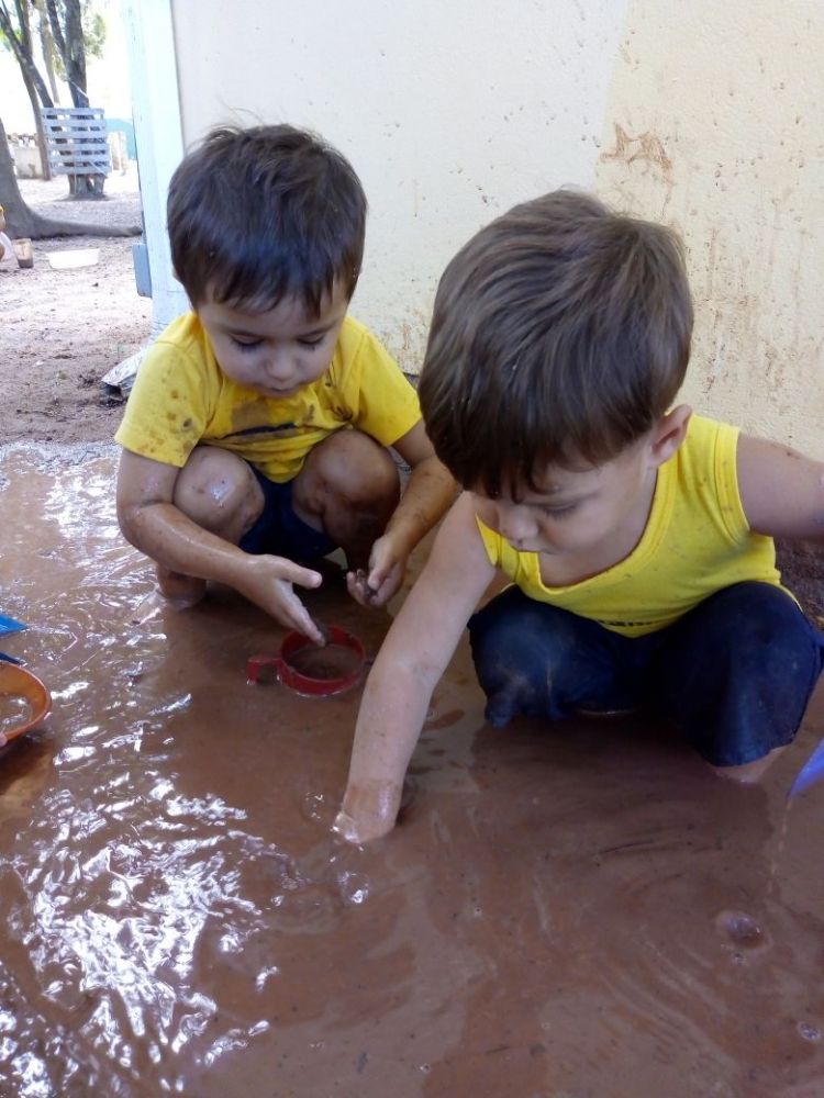 Em outro momento exploraram o elemento terra e se divertiram brincando ao misturar terra com água. Quando perceberam a lama que se transformou ao misturar os dois elementos, foi bagunça na certa. Passavam lama pelo corpo, pulavam, sentavam nas poças e ainda riam dos amigos que estavam enlameados.