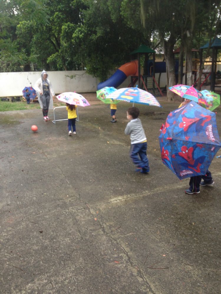 Surgiu a chuva para lavar toda essa bagunça, e as crianças puderam se proteger com guarda-chuvas e galochas. Assim jogaram futebol na chuva sem sair de baixo do guarda-chuva. Quando a chuva enfim parou, andaram pelas poças de água formadas pelo pátio da escola - aquelas que eles ficam desejando entrar nos dias de chuva.