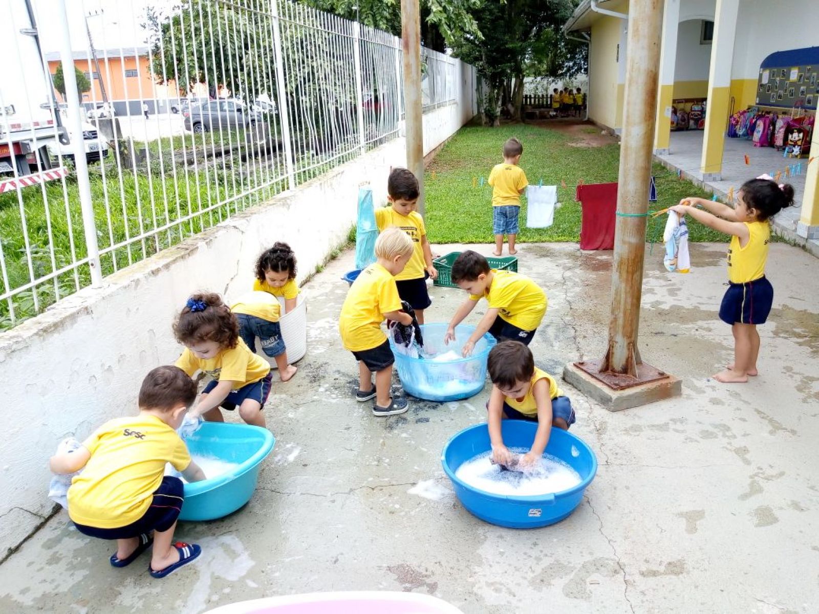 Para explorar o elemento água, a equipe trouxe para a escola: baldes, bacias, banheiras e roupas para lavar. Foi improvisado varais na altura das crianças para que elas pudessem estender as roupas e observar o vento e o sol secá-las com seu calor e balanço.