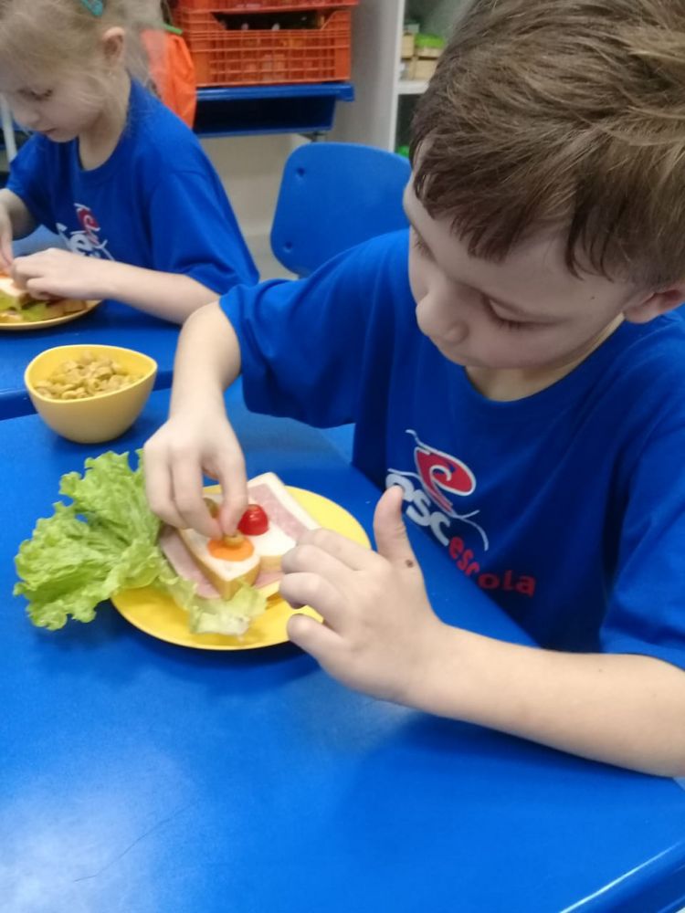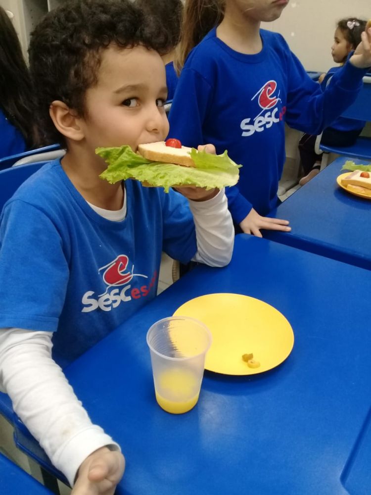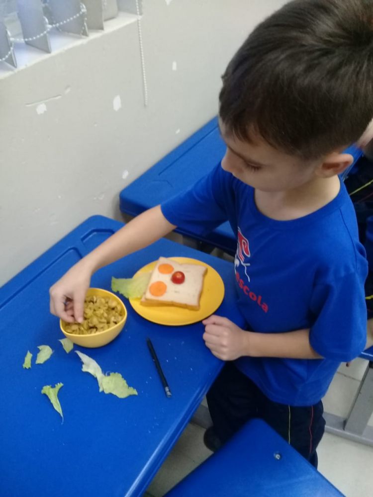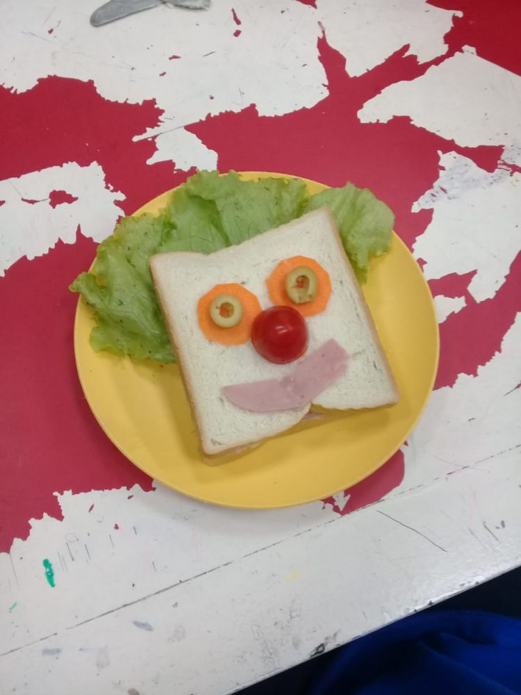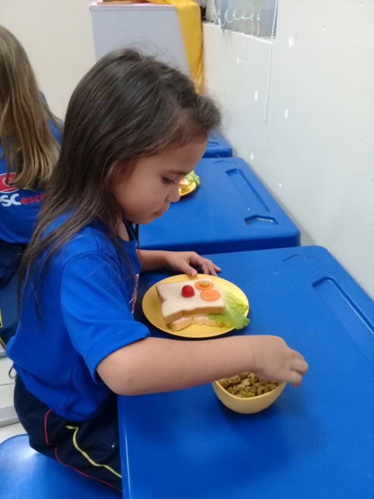 Cada aluno recebeu uma imagem e montou seu sanduíche com formato de palhaço. Com uma variedade de alimentos saudáveis, eles foram estimulados a experimentar alguns ingredientes, que não fazem parte do seu dia a dia, já que no coletivo as crianças se sentem mais motivadas e a experimentação fica mais fácil.