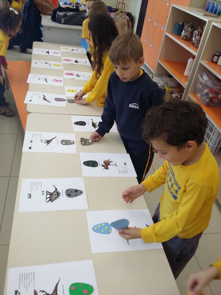 Para responder os questionamentos lançados, realizaram uma caçada aos ovos de dinossauros perdidos pelo parque, cada criança deveria encontrar um ovo e permanecer com ele para descobrir a qual dinossauro ele pertencia, este seria o seu amigo dinossauro. Retornando a sala o sentimento era de curiosidade, haviam diferentes fichas espalhadas sobre a mesa, e cada um deveria localizar a sua ficha para descobrir o seu amigo dinossauro.