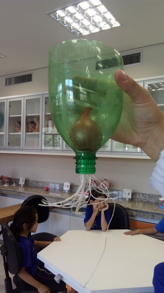 como material de aprendizagem garrafa pet, papel alumínio, água e cebola