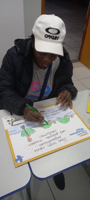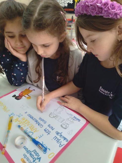 Além dos cartazes com mensagens reflexivas, as escolas também foram contempladas com versões personalizáveis. Esses cartazes, já emoldurados, possuem espaços em branco para que estudantes e a equipe escolar possam criar intervenções artísticas.