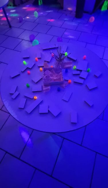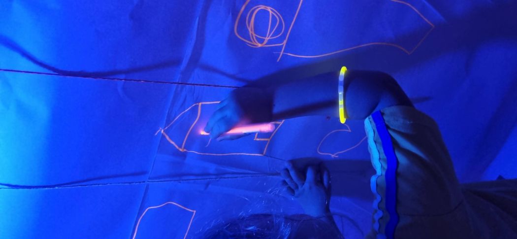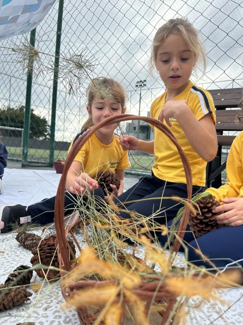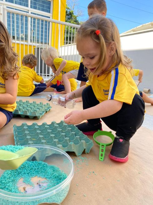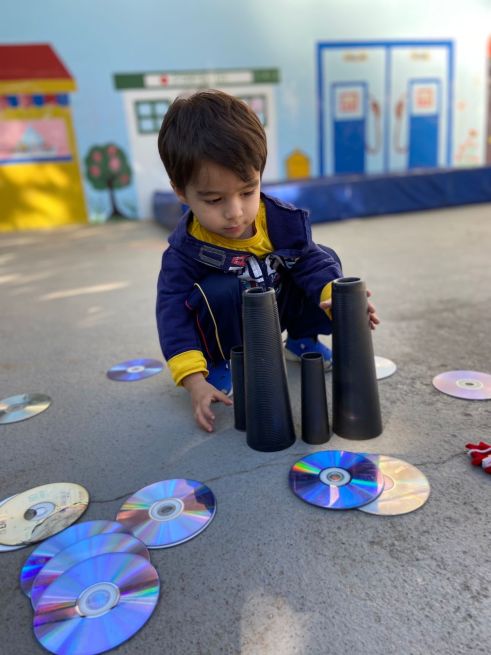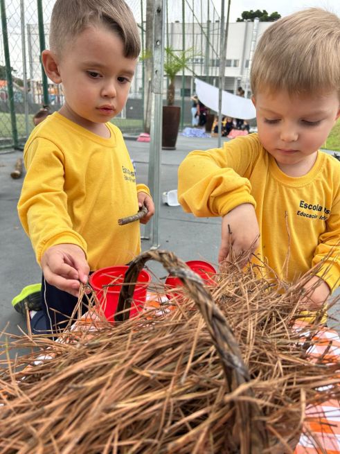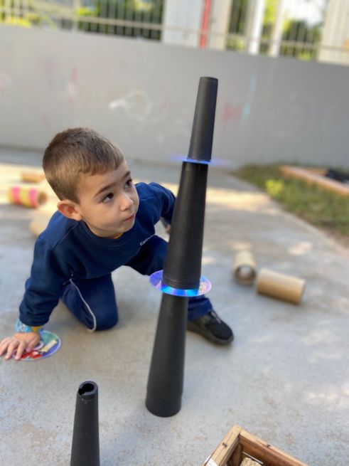 Os materiais não estruturados são um ponto central neste processo: objetos do cotidiano, como funis, peneiras, cones, caixas e bobinas, são utilizados para dar forma às criações das crianças. Com esses itens, elas exercitam a imaginação ao explorar diversos usos, como transformar um cone em um chapéu de brincadeira ou em uma base para a construção de uma torre.