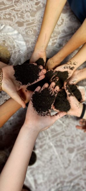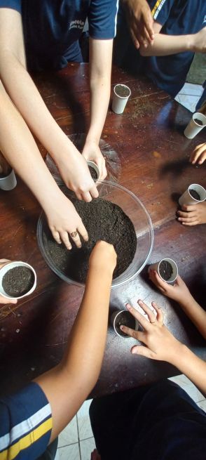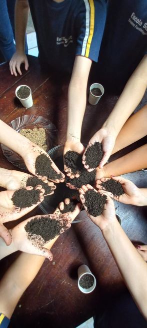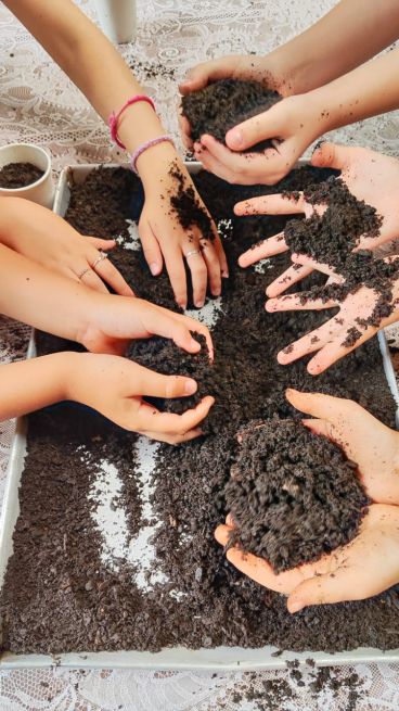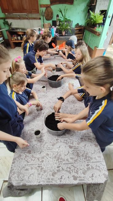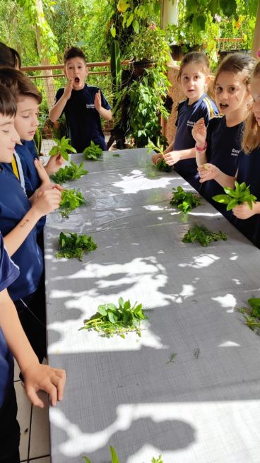 Na horta, conceitos abordados em sala, como "dentro-fora", "grande-pequeno", "cheio-vazio", texturas e cores, ganharam vida por meio da observação e interação direta com o ambiente. Um dos momentos mais marcantes foi a atividade conduzida pela Chef Marigilda Dalarosa, que apresentou às crianças como preparar compostagem, além de incentivá-las a plantar sementes de chás.