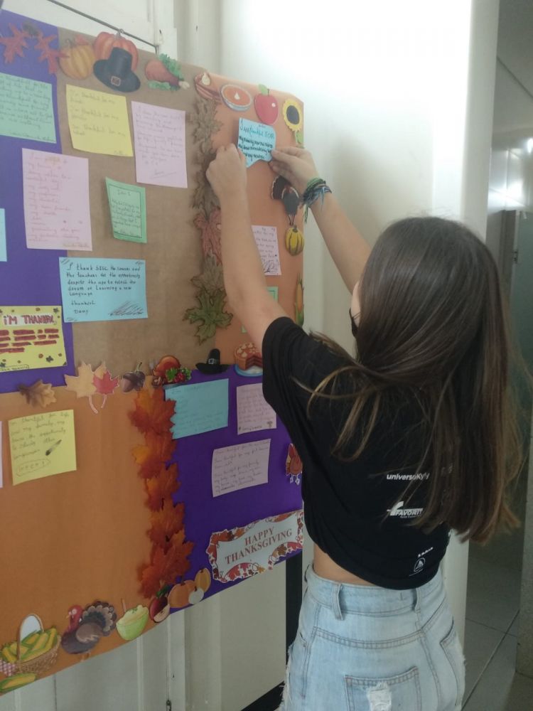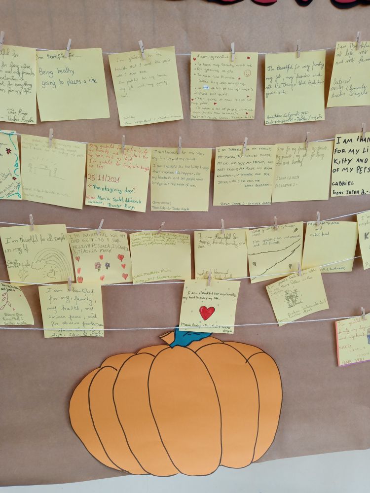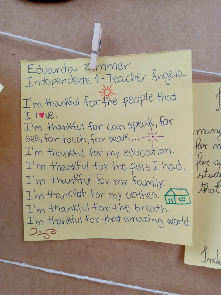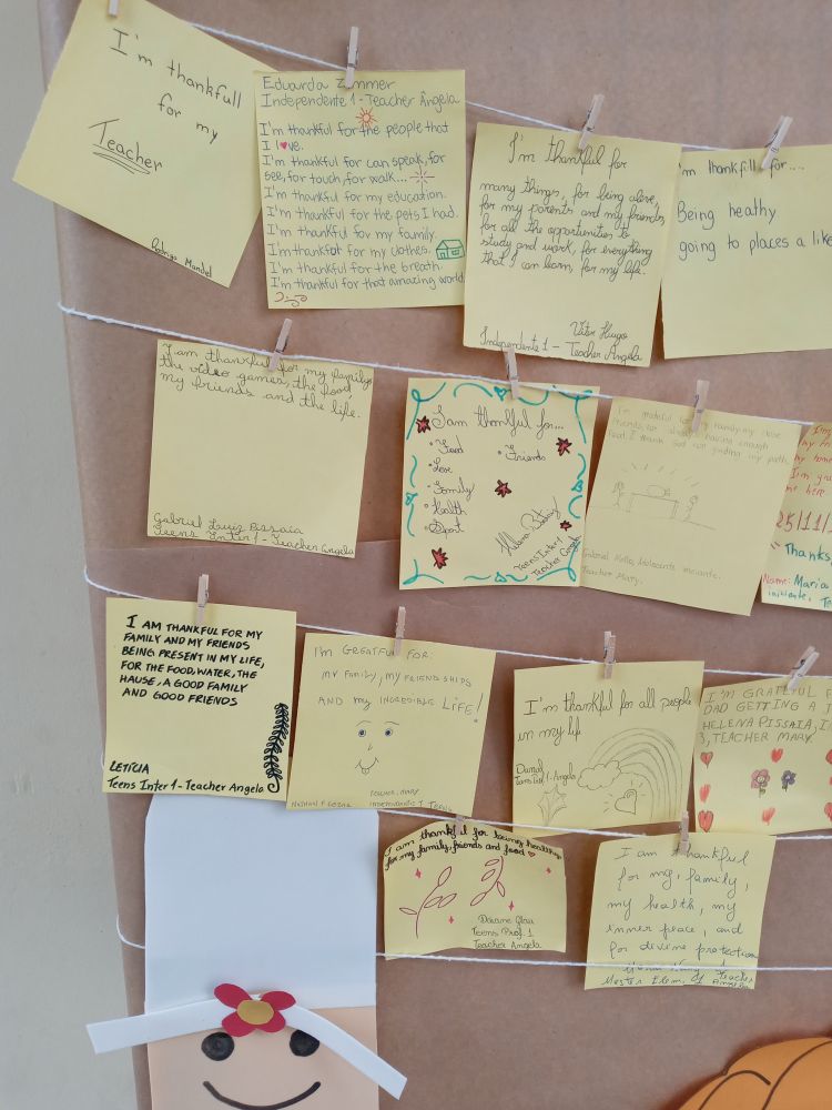 De acordo com a instrutora de Inglês Ângela: “Trabalhar o Thanksgiving com os alunos foi muito bacana. Eles puderam parar por um momento, refletir e agradecer por todas as coisas boas que eles têm. Acho que essa é a importância dessa data, refletir sobre como até as pequenas coisas são motivos para sermos gratos”.