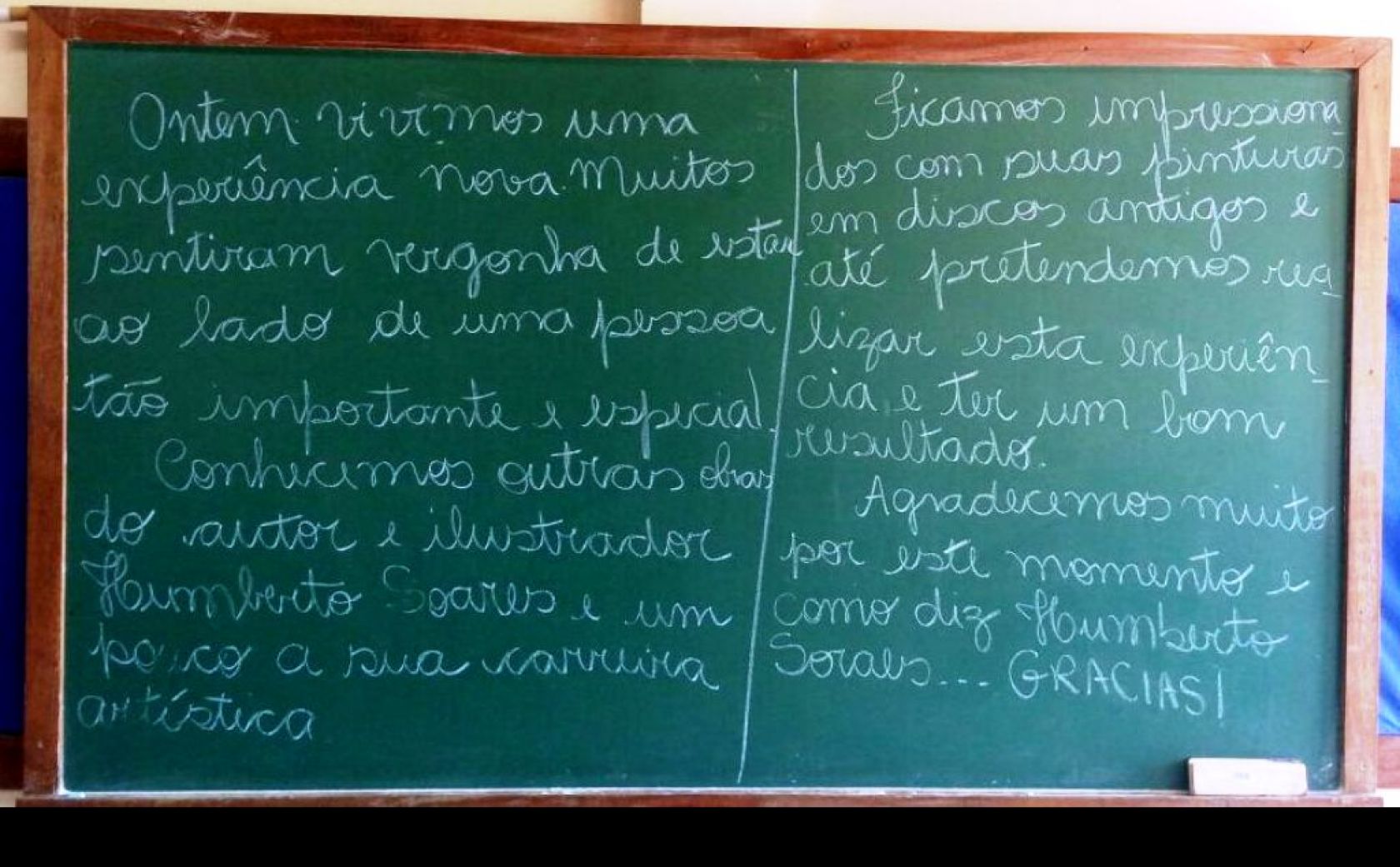 Aprendizado e ensinamento, um processo emocionante para todos, é o que relata a própria professora da turma organizadora, Fabrícia Brito comenta que "fazer o que gosta é transmitir ao próximo a felicidade plena. Sim. Felicidade foi o que eu senti na tarde de hoje. Felicidade de perceber os olhos brilhantes e atentos das crianças. Da generosidade e simplicidade de um artista. Das possibilidades que a arte tem de transformar o ser humano. De nos deixar mais completos. Ver o nervosismo das crianças em apresentar o evento, declamar poesia ou fazer as perguntas ali bem pertinho do artista que eles tanto admiram foi recompensador. Eles estavam entregues, abertos, curiosos e alegres com tanta beleza, leveza e cumplicidade. Estou emocionada até agora. Feliz pela possibilidade de mais uma vez vivenciar a arte e a educação lado a lado, e em transformação. De ter certeza que não precisamos de muito para fazer a diferença. Que tenhamos mais momentos de troca. Que essas crianças possam vivenciar mais alegrias como a que tivemos nesta tarde. E viva a arte do encontro”.