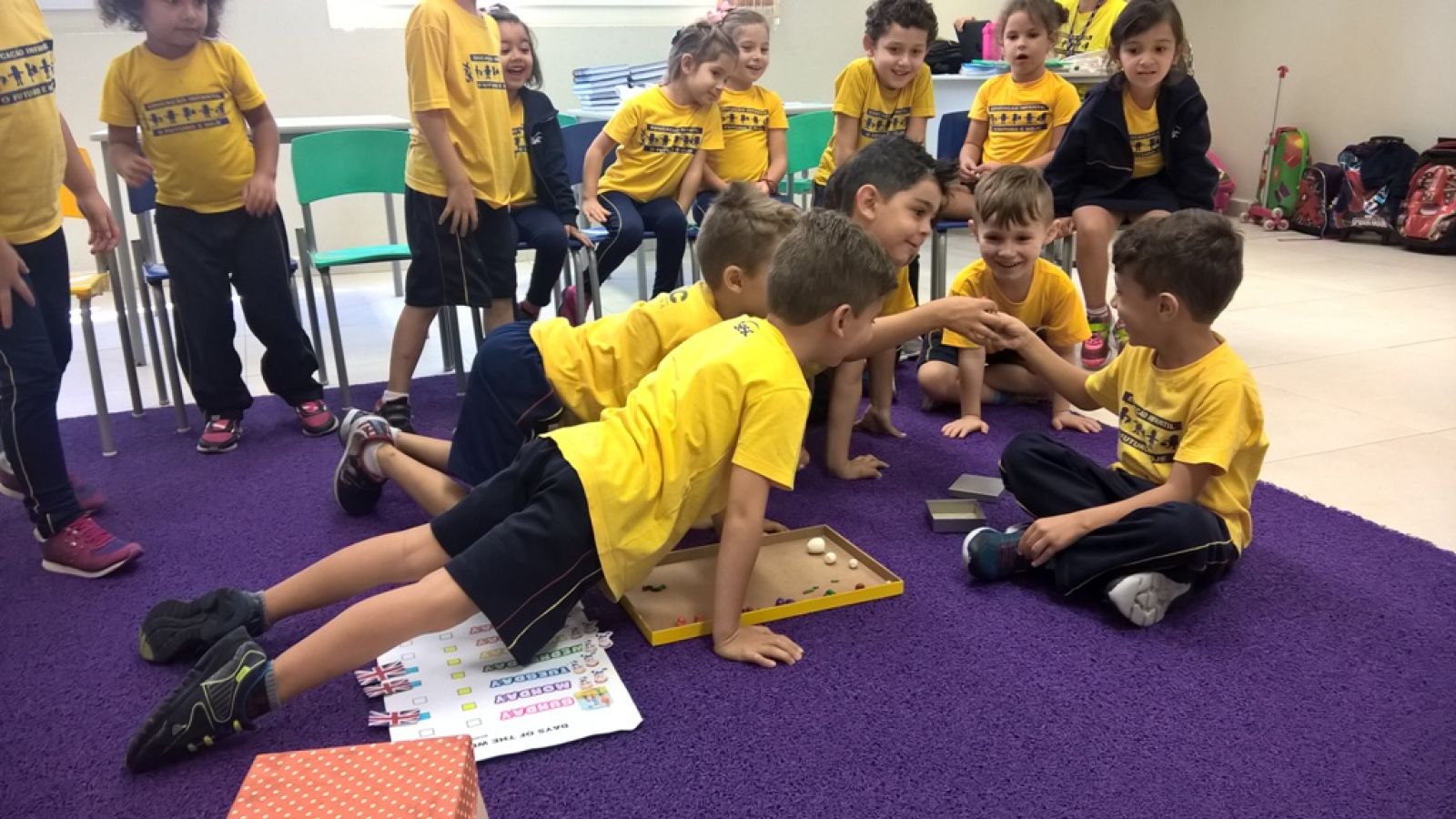 crianças escutaram a história em inglês, recontaram e manusearam o livro e