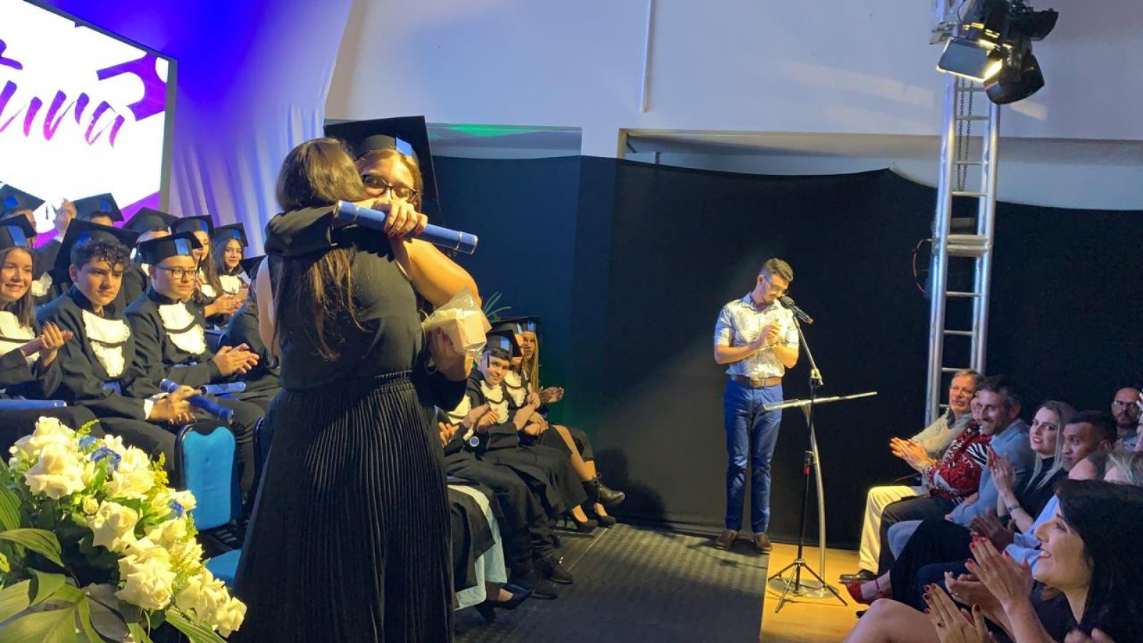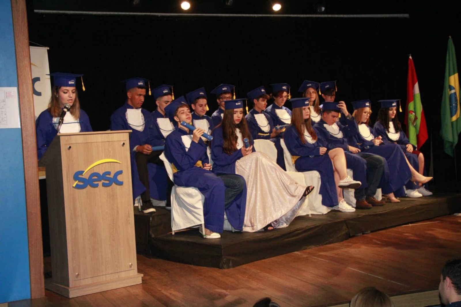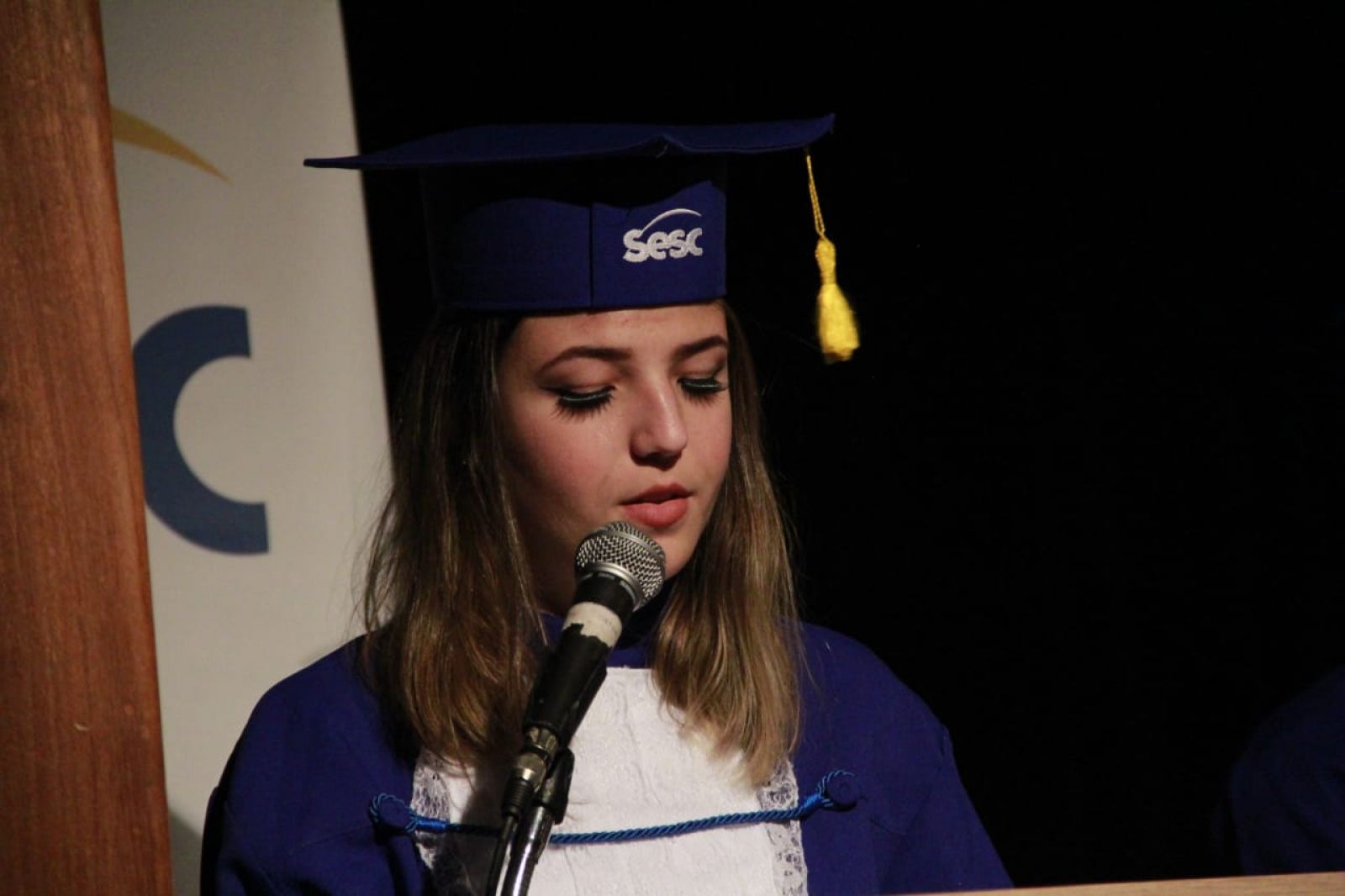 Em Palhoça, esta é a primeira turma a receber o diploma de conclusão do curso na Escola Sesc. No seu discurso, o gerente da Unidade, Wilson Elias Filho propôs uma reflexão: “Quando você cresce, percebe que a definição de sucesso muda. Para muitos de vocês, sucesso significa ser capaz de tomar suas próprias decisões, ser livre. Porém o verdadeiro sucesso, a coisa mais importante da vida é vivê-la com integridade, e não se entregar à pressão; não tentar ser algo que não é. Viva sua vida como uma pessoa honesta e caridosa; contribua de alguma forma para melhorar nosso mundo. Então para encerrar lhes aconselho: Sigam sua paixão e mantenham-se fiéis a vocês mesmos”.