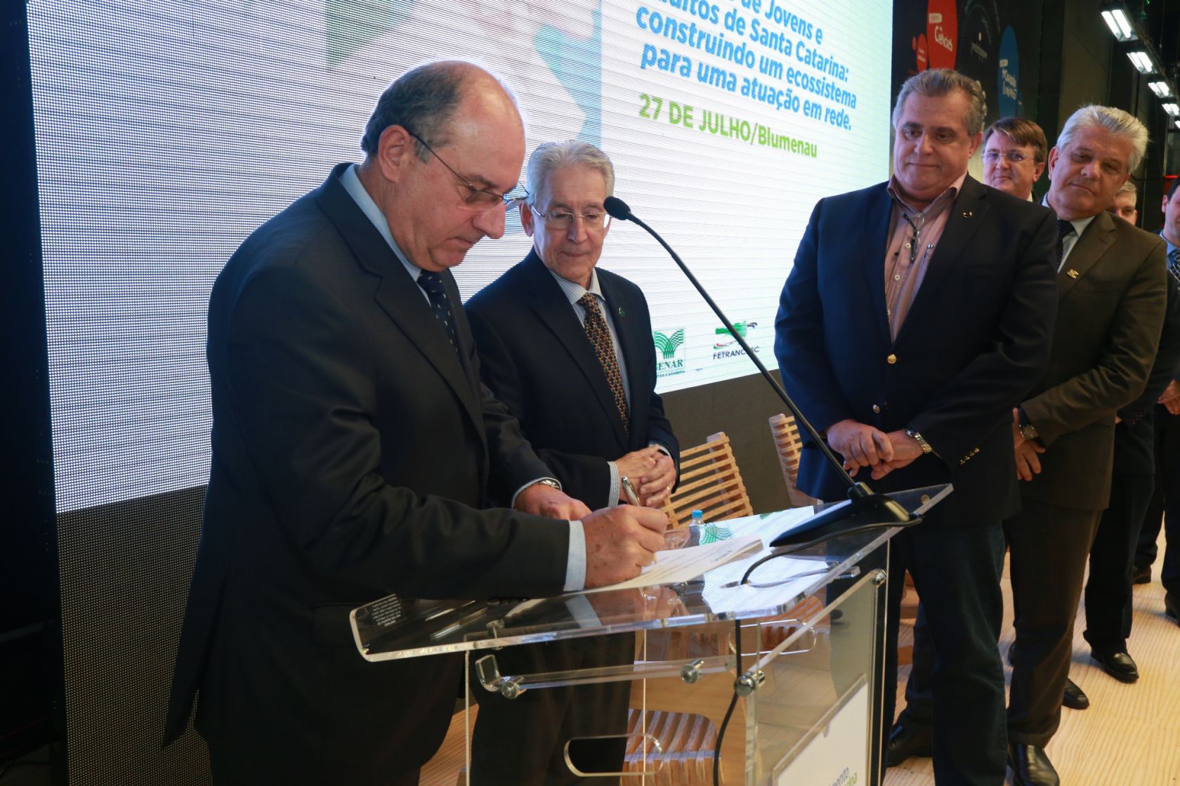A Educação de Jovens e Adultos (EJA) foi tema do encontro nesta quinta-feira (27/07), que contou com a presença do secretário estadual de Educação, Eduardo Deschamps (PSD), ex-reitor da FURB. As Federações da indústria (Fiesc), do comércio (Fecomércio), da agricultura (Faesc) e dos transportes (Fetrancesc) promoveram o seminário Educação de Jovens e Adultos de Santa Catarina: construindo um ecossistema para uma atuação em rede. O evento foi realizado no Complexo Esportivo do Sesi, em Blumenau, e debateu a educação básica do trabalhador com a participação do especialista Timothy Ireland, coordenador da Cátedra da Unesco em EJA. O evento contou também com a presença do Presidente da Fecomércio, Diretores Regionais do Sesc, Senac e equipe.
