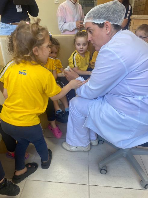 O que acontece com os dentes das crianças quando se usa muito bico ou mamadeira? Para responder a essa e outras questões relacionadas à saúde bucal dos primeiros anos de vida, a Turma da Alegria do Sesc Chapecó contou com o apoio da equipe da clínica de saúde da Unidade, que reuniu os alunos da educação infantil da escola Sesc em uma visita especial ao dentista.
