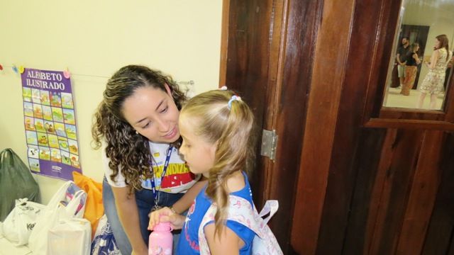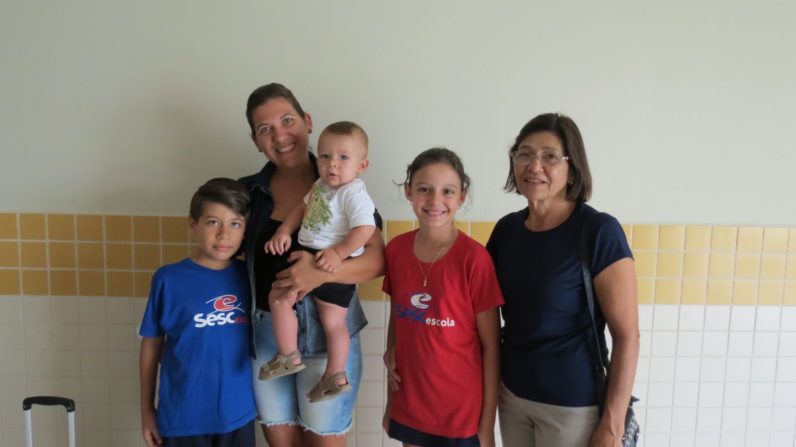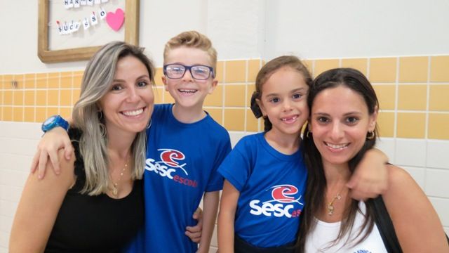 Os alunos Leonardo e Lívia ambos do 1º ano, antes de chegarem na Escola Sesc, passaram a sua vida escolar em outra escola. Agora, eles enfrentam juntos a típica ansiedade do 1º dia de aula. “Estou ansiosa! Parece que está todo mundo olhando para gente. A parte boa é conhecer pessoas novas”, revela os novos alunos, que ficaram felizes por ter se encontrado, já que Leonardo deixou na escola antiga, uma amiga também chamada Lívia. Na foto: A mãe Naiara Rocha e seu filho Leonardo, Lívia e sua mãe Juliana Santos.