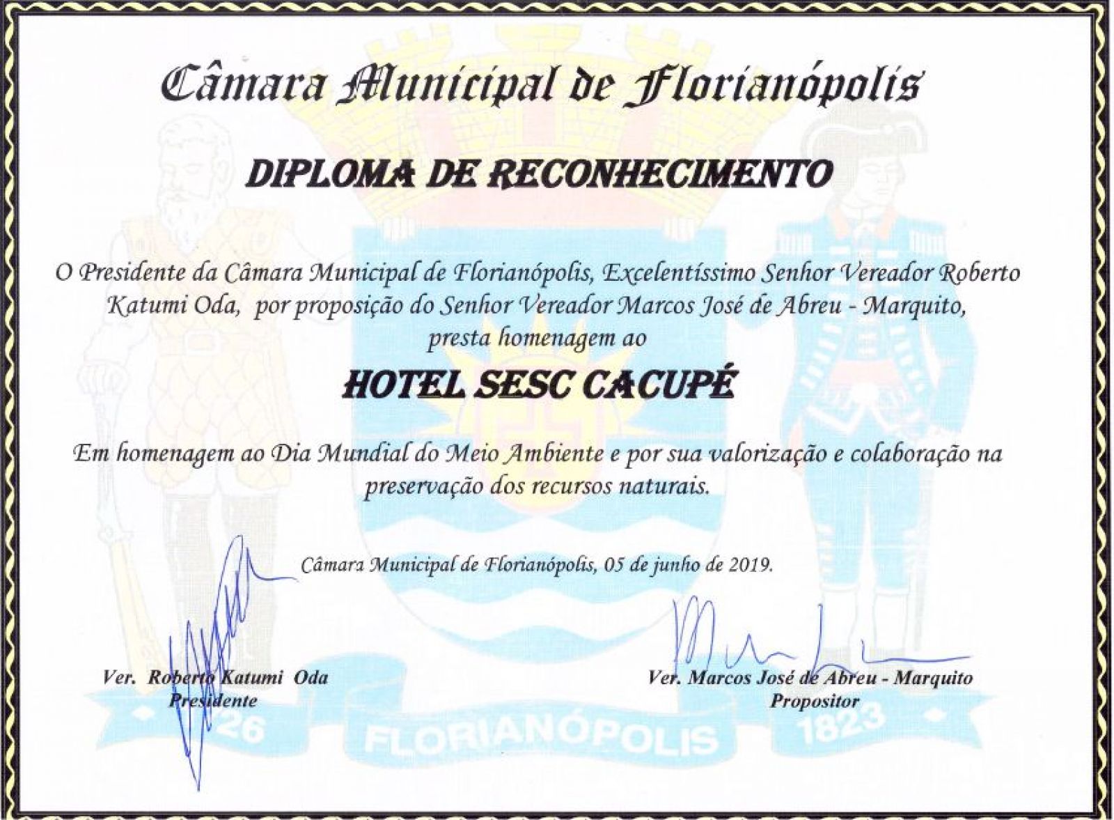 O trabalho de educação ambiental do Hotel Sesc Cacupé, em Florianópolis, recebeu na quarta-feira, 05/06 – Dia Mundial do Meio Ambiente – o Diploma de Reconhecimento, por valorização e colaboração na preservação dos recursos naturais, da Câmara Municipal de Florianópolis. O autor do requerimento, foi o vereador Marcos José de Abreu, o Marquito.