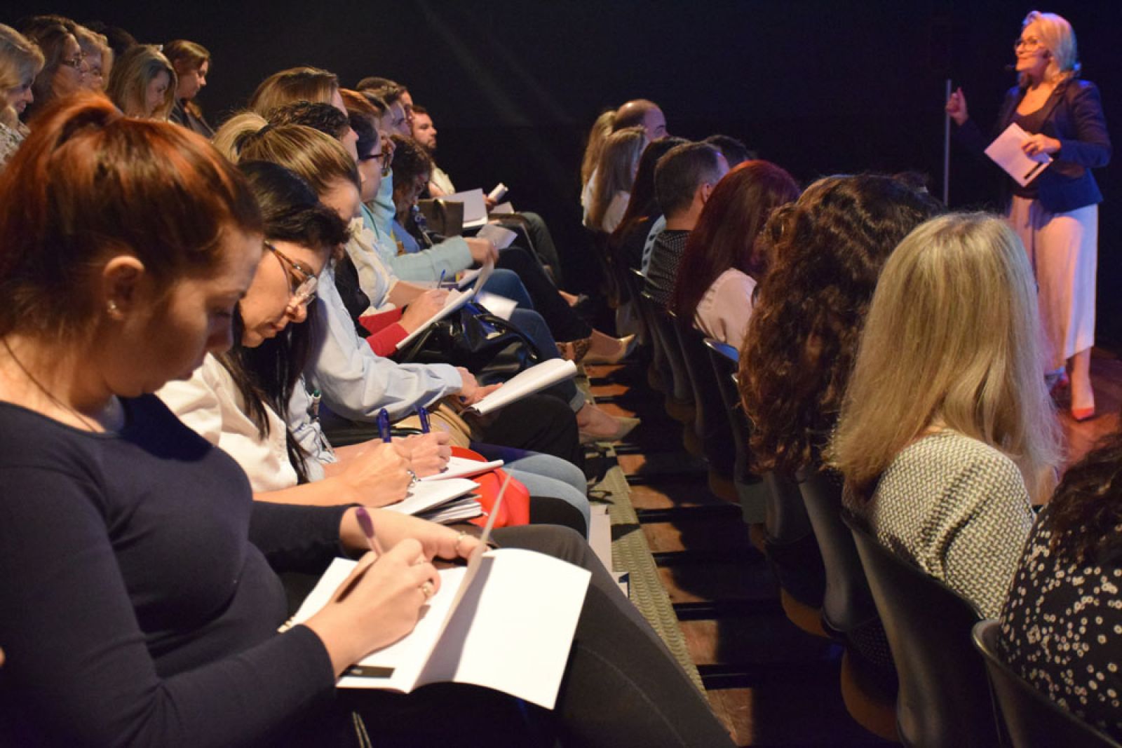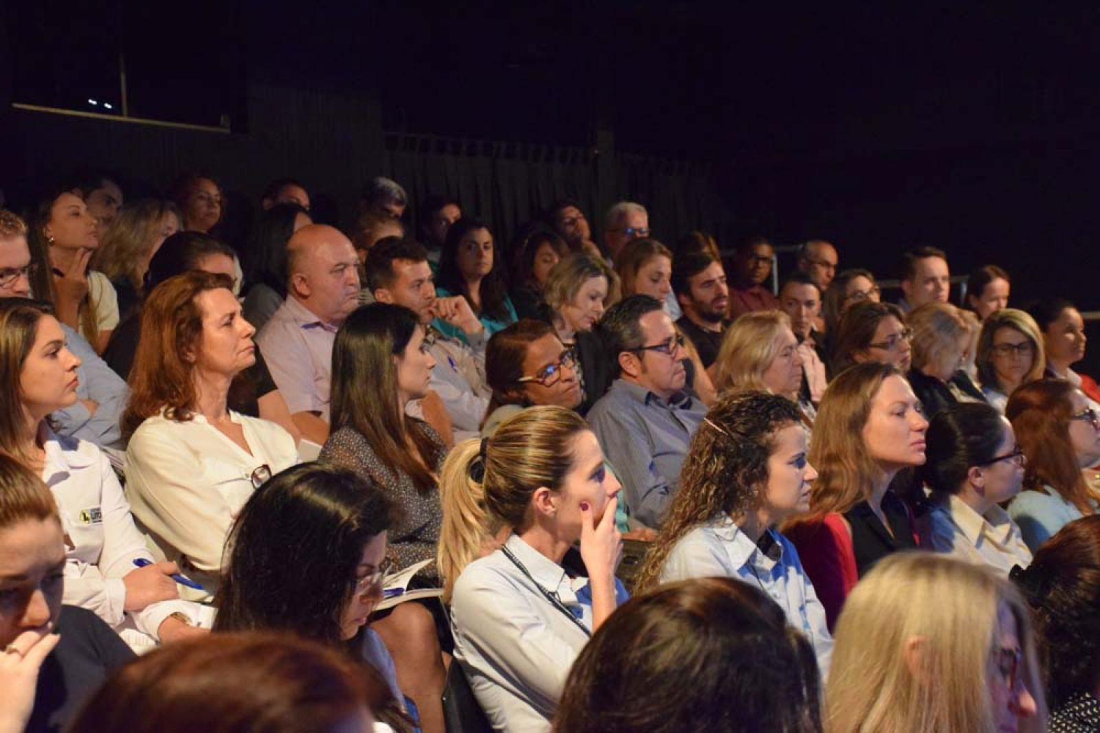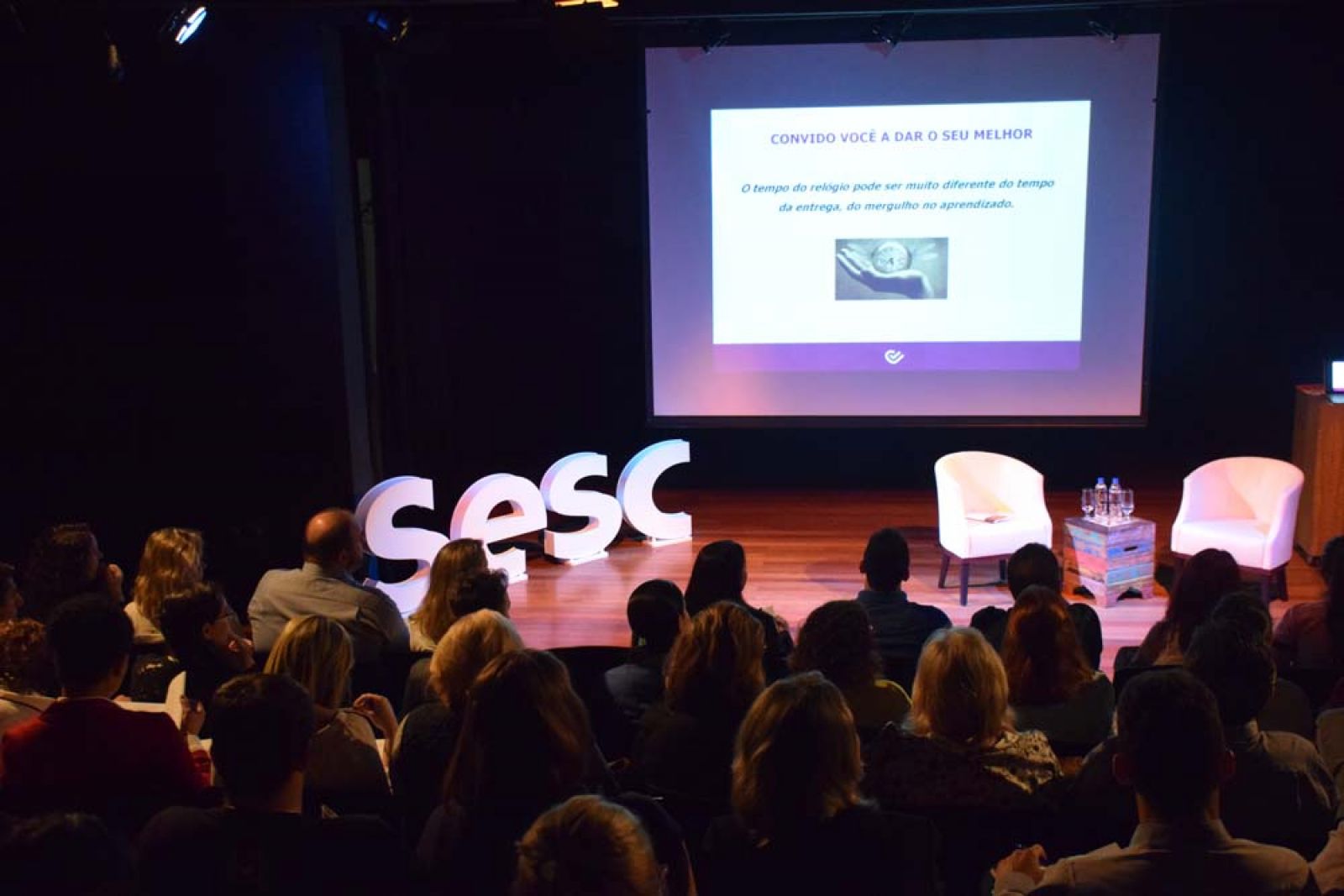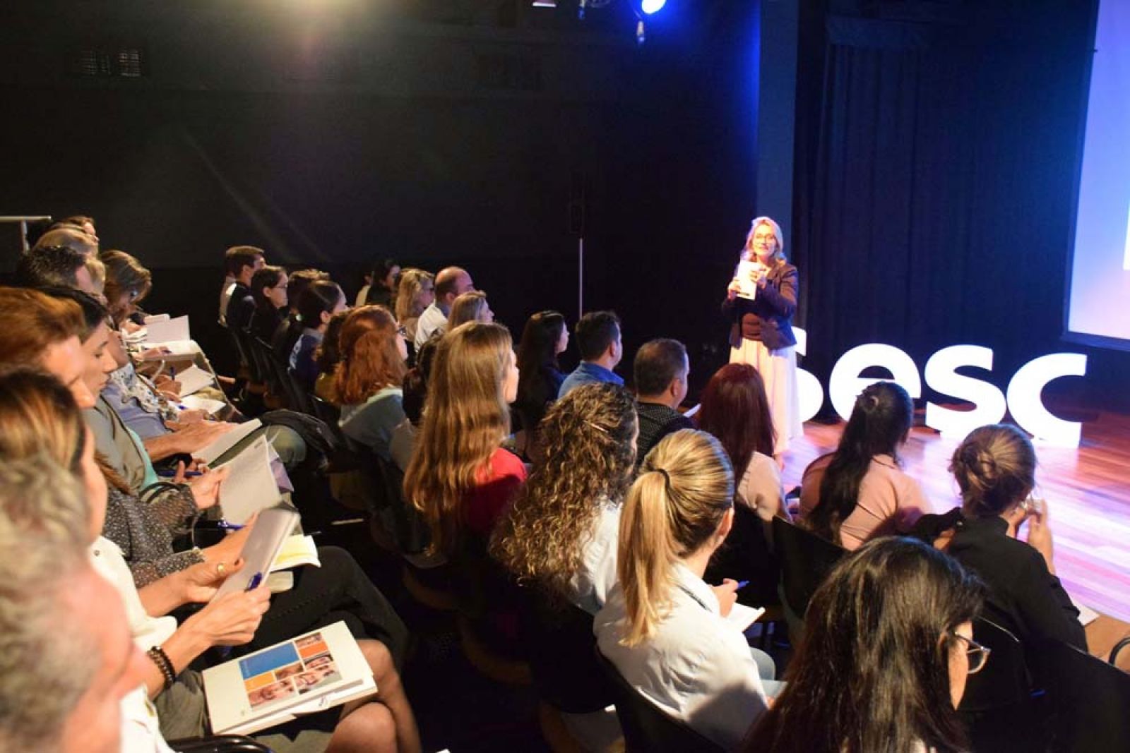 no Teatro Sesc Prainha, em Florianópolis. A plateia lotada, com 106 participantes