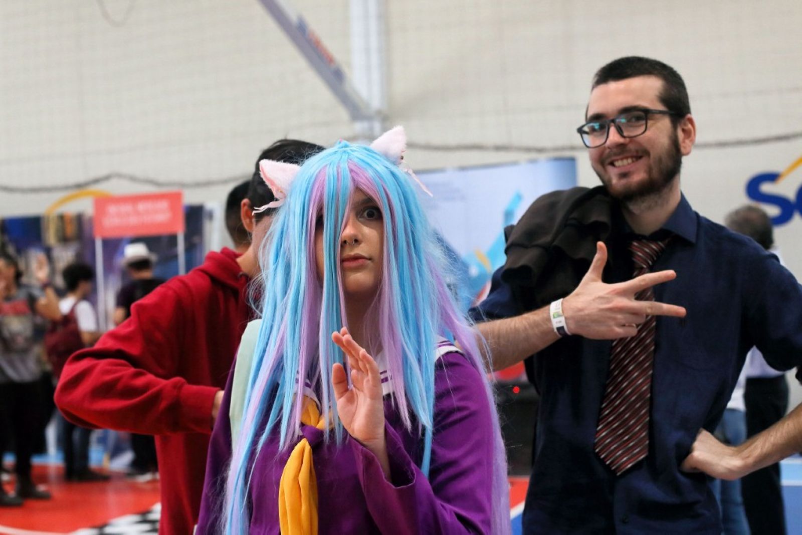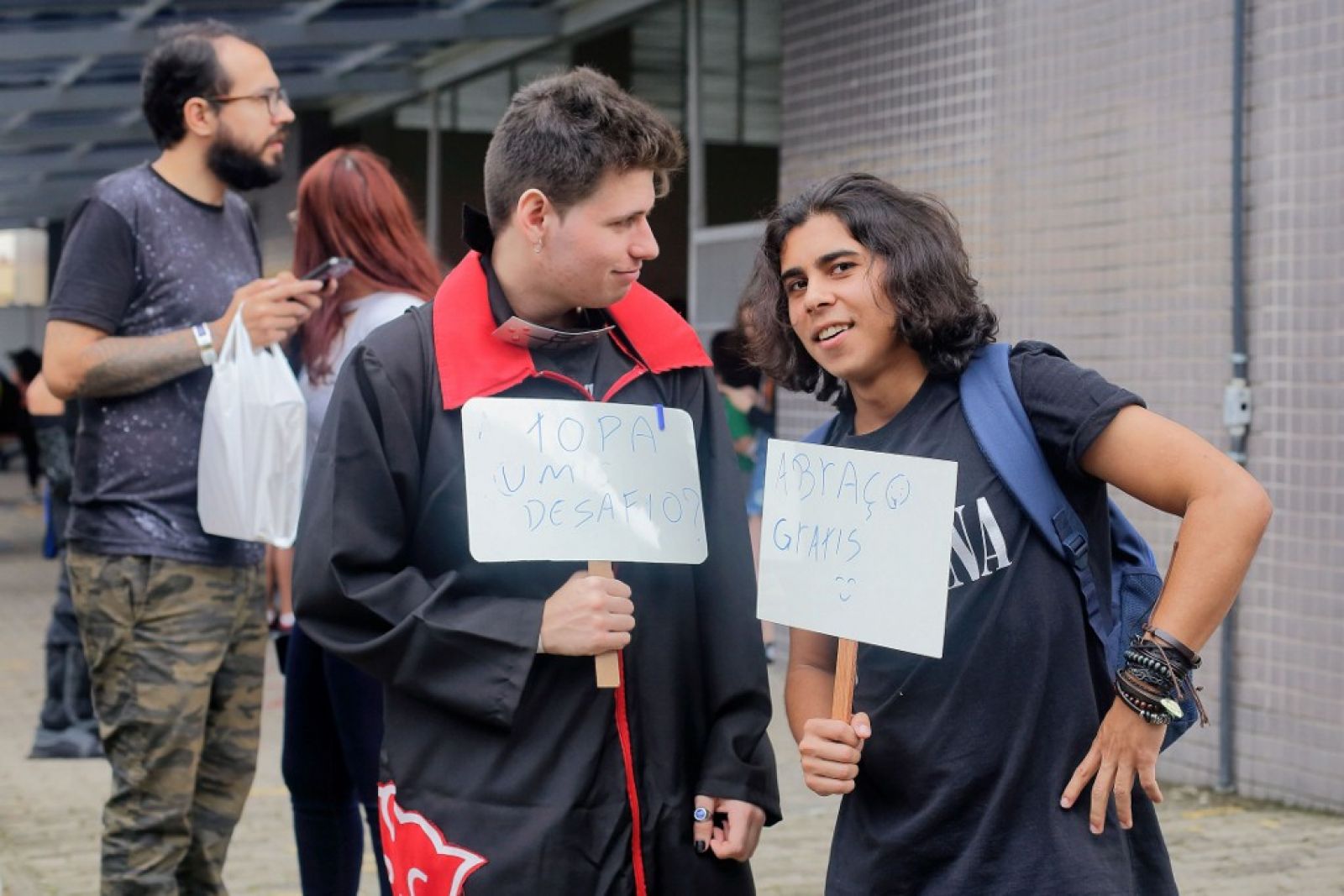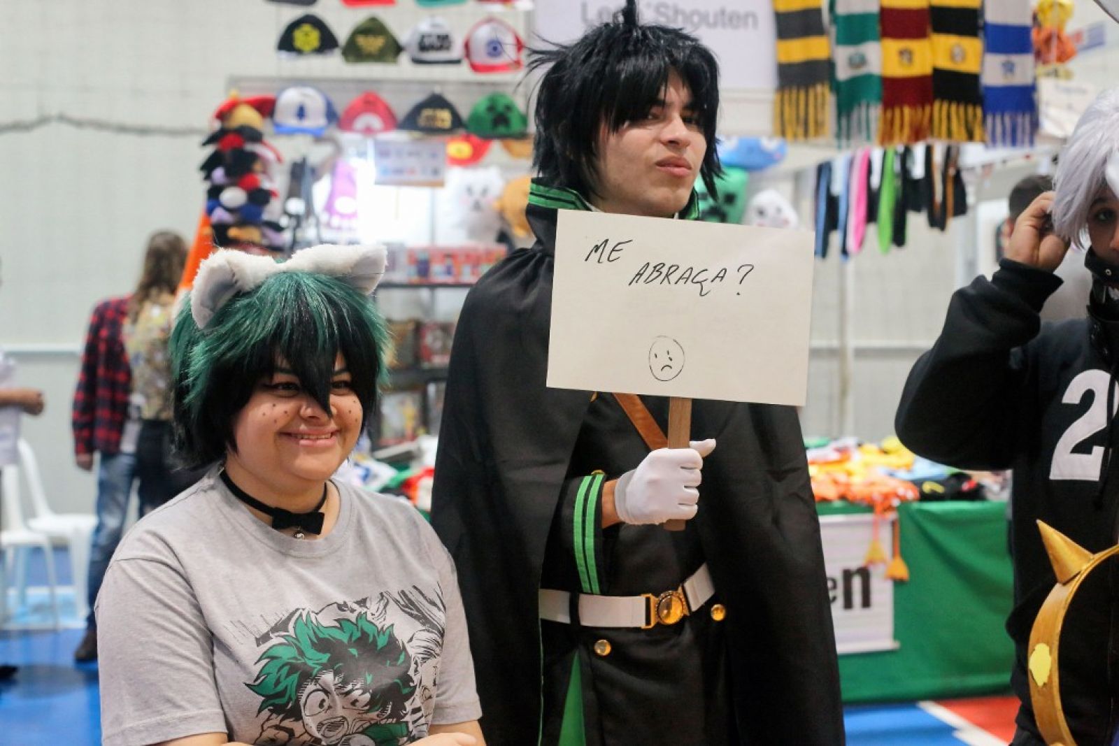 O k-pop foi o que trouxe a estudante Emely Soares e os colegas do 1º ano do Ensino Médio para o evento. A turma se considera “100% geek” e circulou com a plaquinha que virou febre, onde cada um podia estampar a mensagem que queria passar. A deles oferecia “abraços grátis”. “É um lugar onde nos sentimos confortáveis, pois encontramos pessoas que gostam das mesmas coisas que a gente”, conta a jovem.