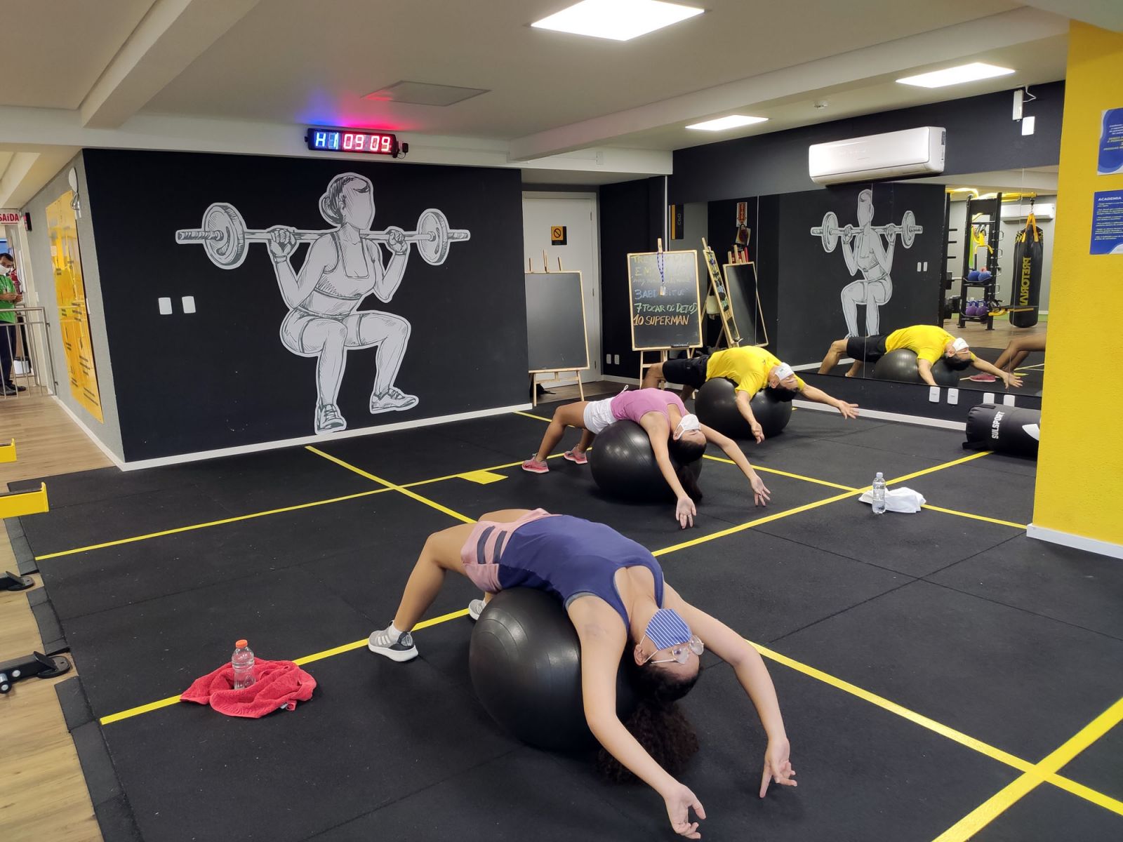 A marcação dos espaços e o distanciamento entre os alunos são monitorados para assegurar conforto e segurança no momento do treino.