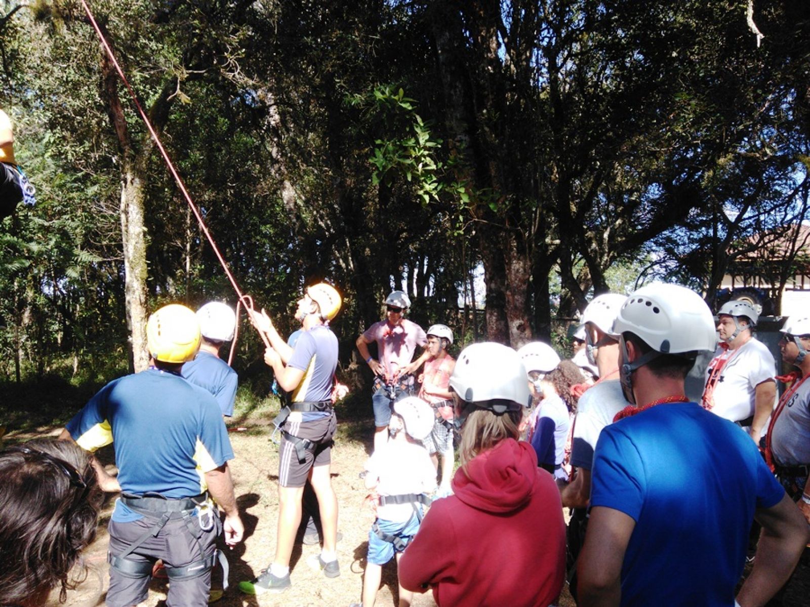 segura que inclui: capacete, corda e cinto de segurança, além dos profissionais