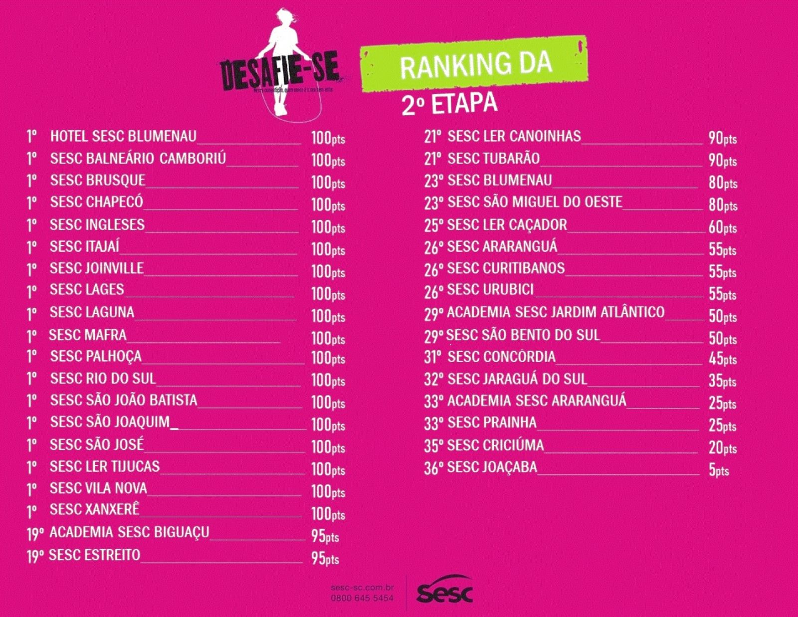 A ação é voltada aos clientes matrículados nas modalidades de Treinamento Multifuncional (TMF), Ginásticas, Pilates Solo e Estúdio, CrosSesc e Movimento Teen e esta segunda etapa acontece até o dia 6 de junho. Participe você também desta transformação de hábitos, pois além de cuidar da sua saúde, você se diverte e ainda concorre a brindes e diária nos hotéis Sesc SC.
