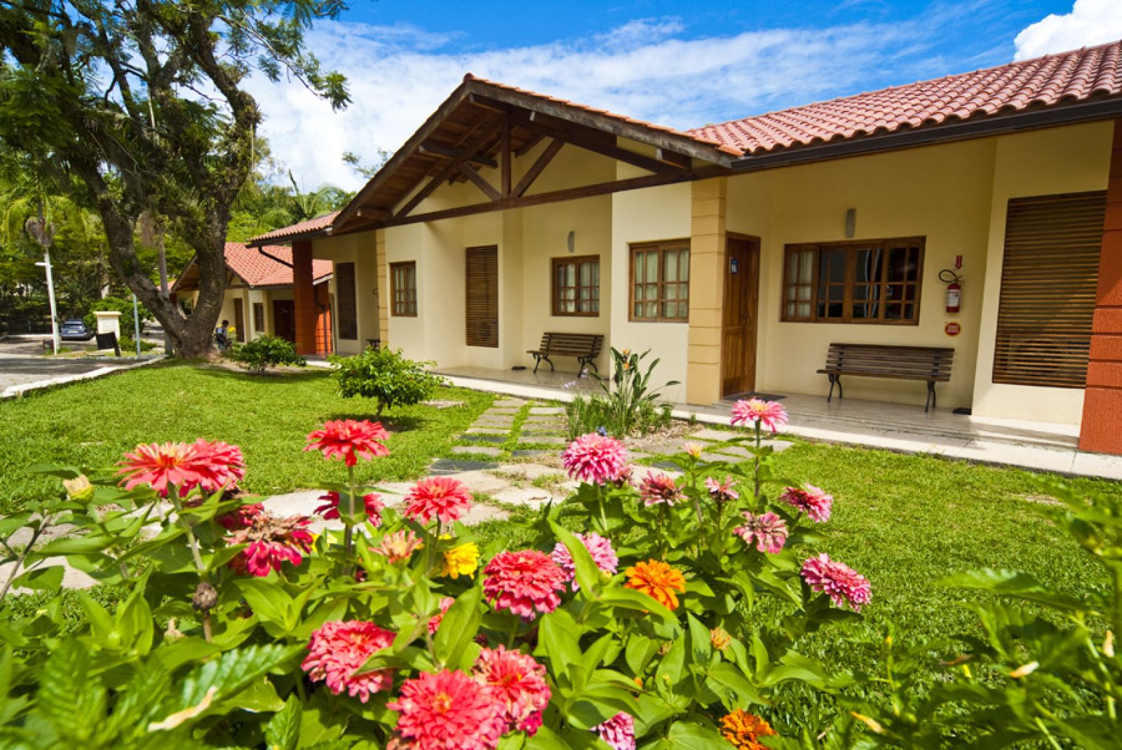 para hóspedes e visitantes. São 57 chalés, 48 apartamentos, com quartos