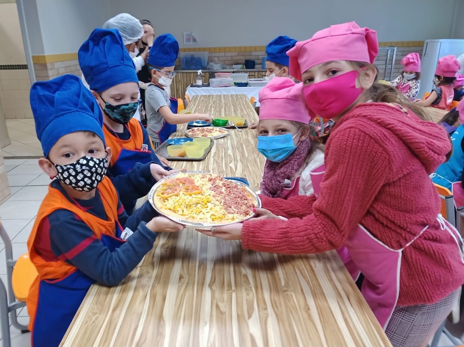 Na primeira semana, as crianças puderam preparar as pizzas para seu próprio lanche, colocando o molho, queijo, os recheios de acordo com as preferências. Alguns participantes relataram que também faziam pizza com os pais em suas casas e já eram craques nessa arte, mesmo assim acharam muito divertido e adoraram degustar suas preparações no lanche.