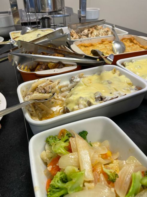 Entre os pratos oferecidos estavam clássicos como Revithia Salata, Spanakopita, Moussaka, Hoirino Me Selino e Galaktoboureko, preparados com ingredientes típicos e temperos característicos da culinária mediterrânea. A proposta foi oferecer aos clientes uma experiência gastronômica autêntica, reforçando o compromisso do Sesc com a valorização da diversidade cultural por meio da alimentação.