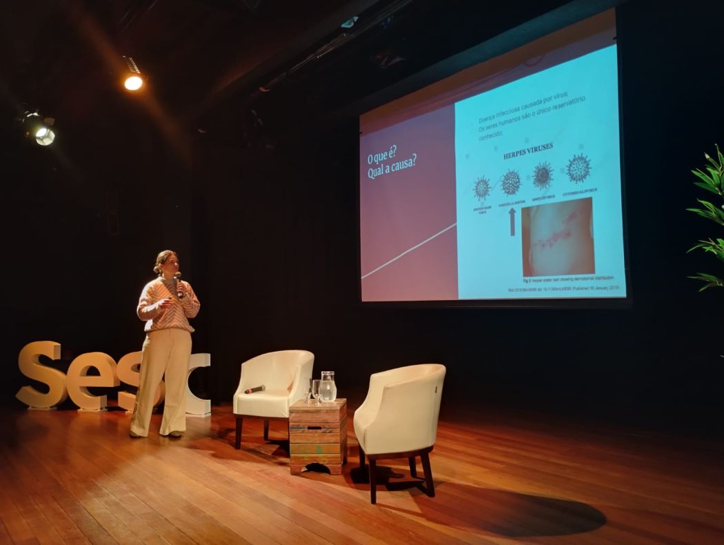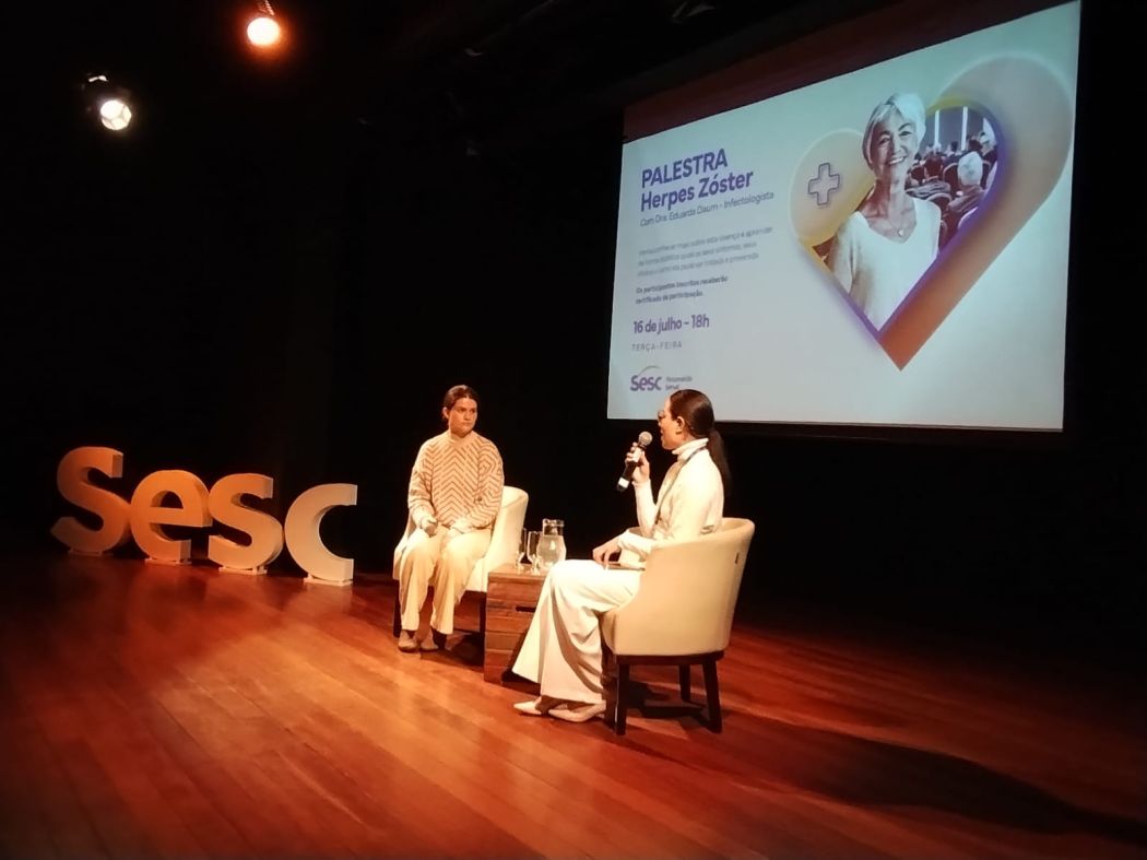 A Sala de Vacinas do Sesc Prainha (Florianópolis) promoveu no último mês a palestra sobre Herps Zoster. Conduzida pela Drª Eduarda Daum, médica infectologista, a palestra trouxe as principais informações e cuidados sobre a doença. O evento teve formato híbrido, presencialmente no Sesc Prainha, e on-line, por meio da live no Youtube do Sesc-SC.