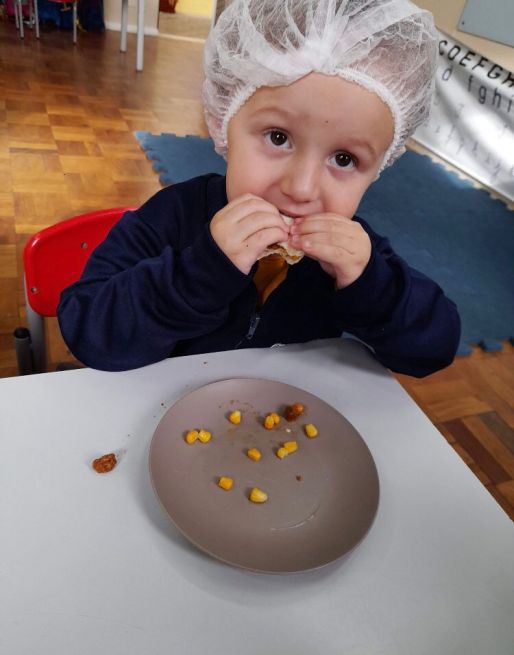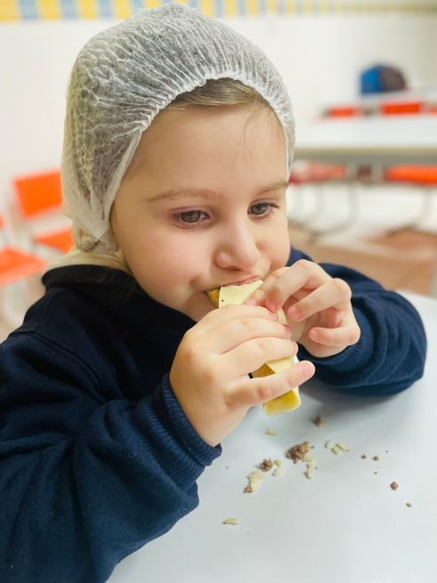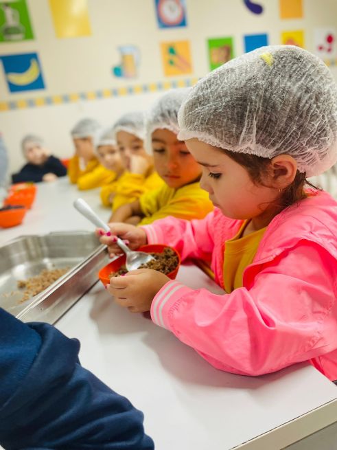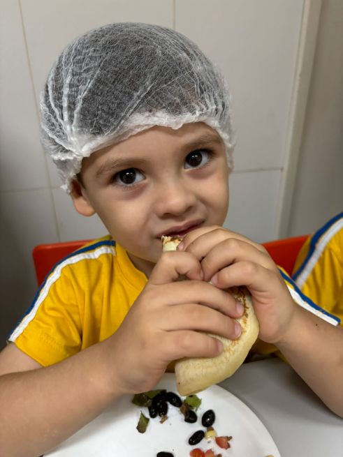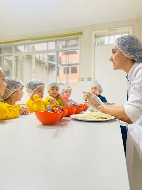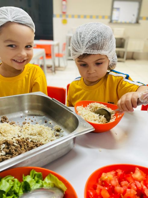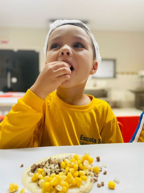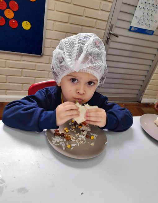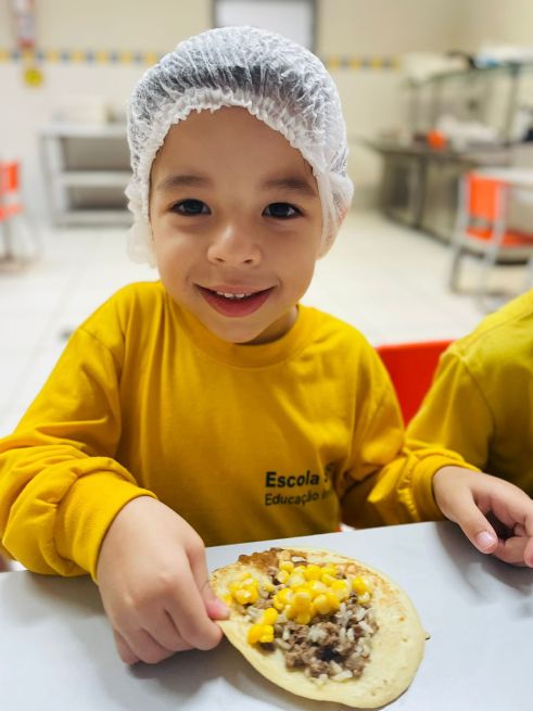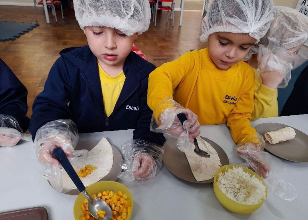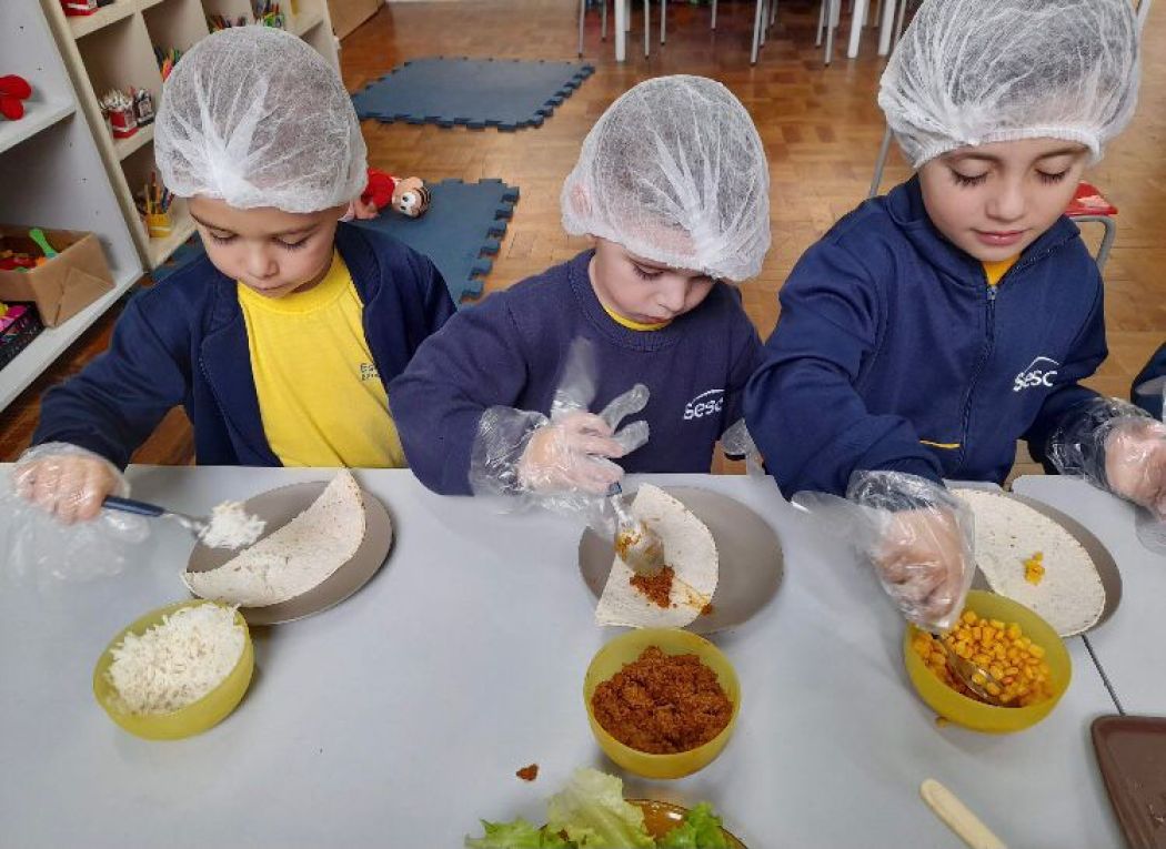 Esses aspectos foram trabalhados com os alunos da Educação Infantil do Sesc por meio de contações de histórias que contextualizaram as características do modo de comer e os níveis de processamento dos alimentos com o efeito de cada um deles sobre a saúde e bem-estar das pessoas; atividades pedagógicas com elementos presentes nas contações de histórias; e uma oficina culinária com a receita do Burrito de arroz com feijão, valorizando a combinação tradicional brasileira dos alimentos e fortalecendo as dimensões culturais e sociais das práticas alimentares.