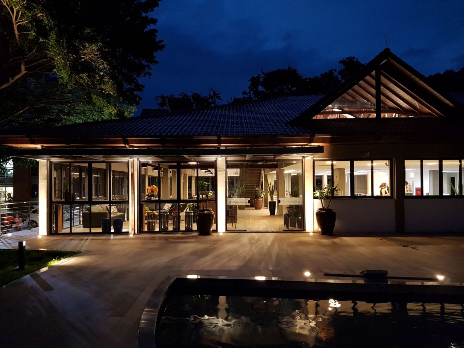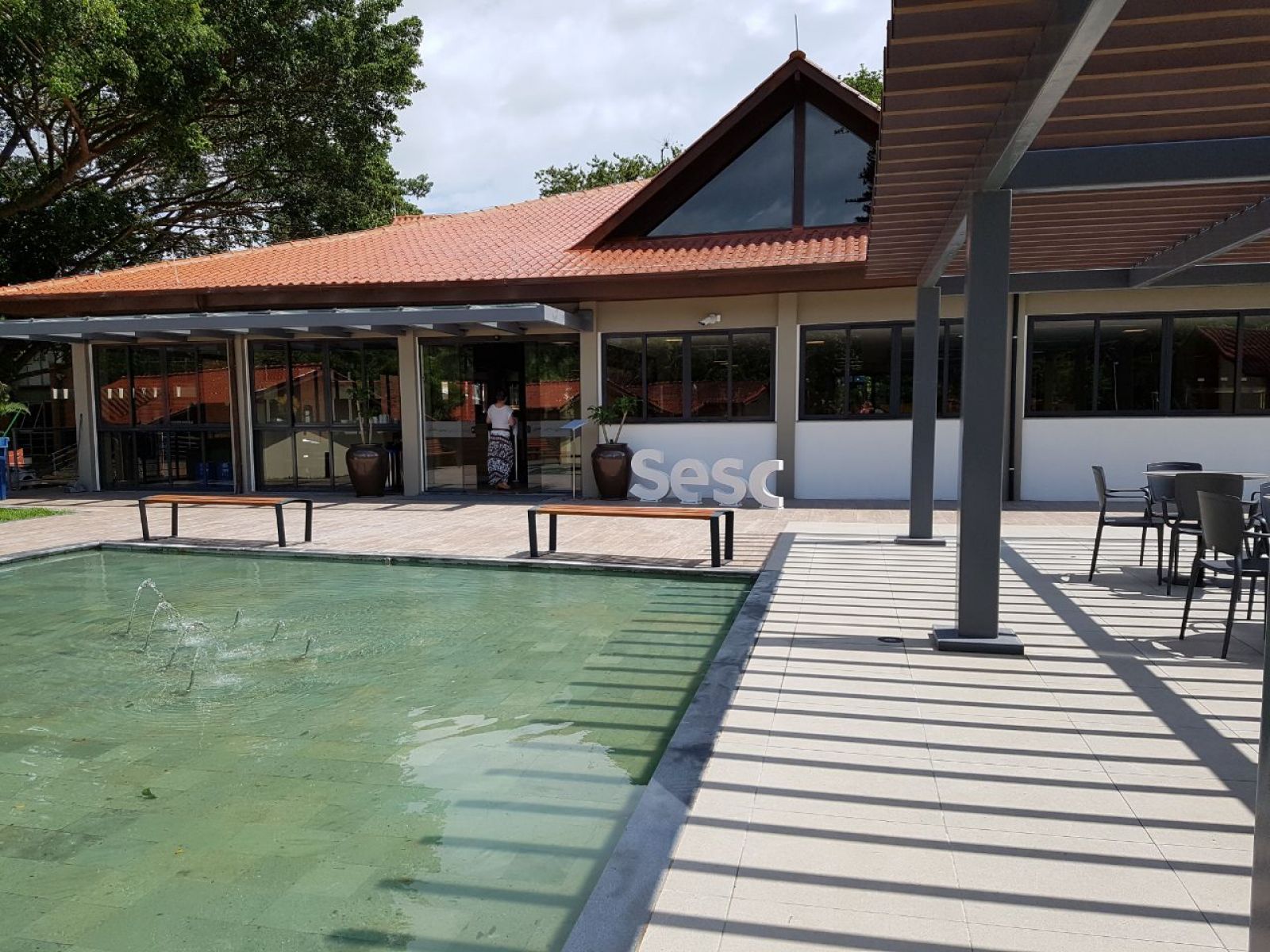 Na parte externa, uma praça com chafariz rodeado por bancos, além de mesas para convivência para acolher ainda melhor os clientes na chegada e na saída das refeições.