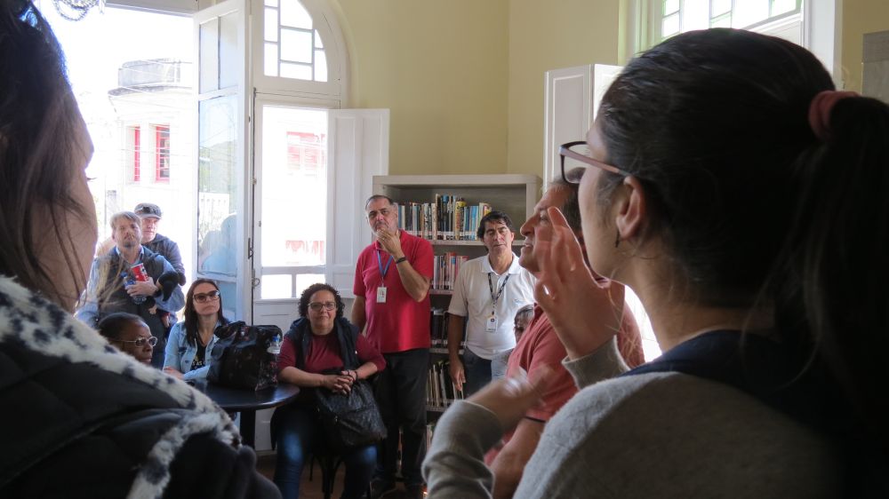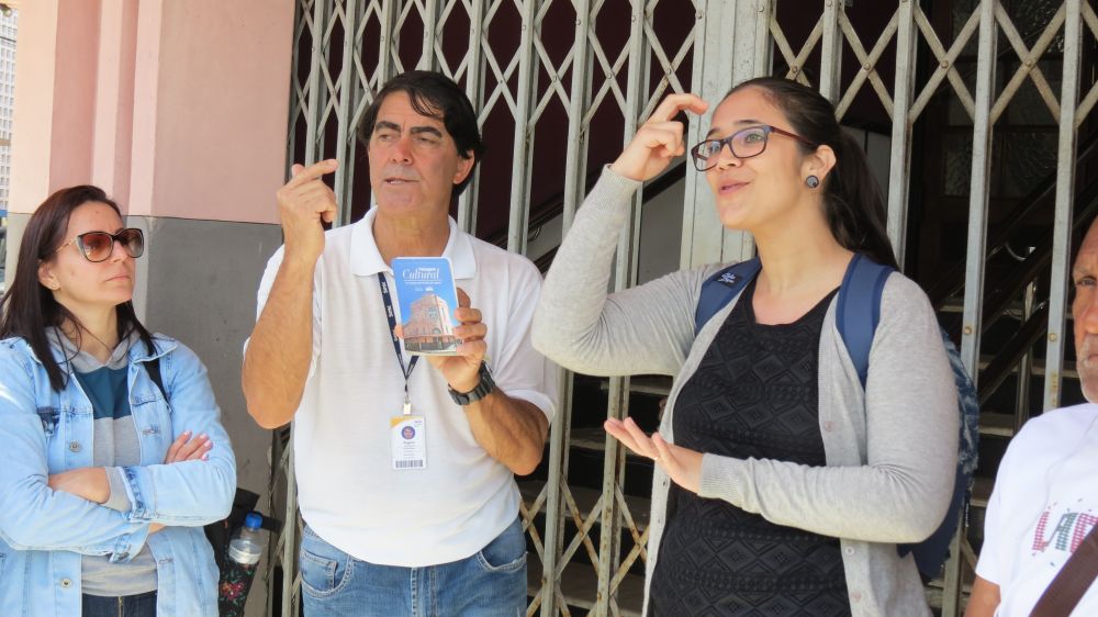 Colaborador do Sesc, o guia de turismo Rogério Rodrigues explica sobre o roteiro com o auxílio da intérprete de Libras.